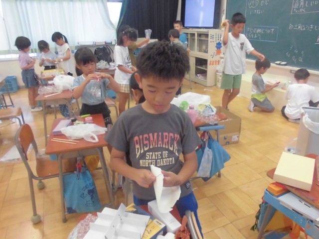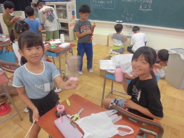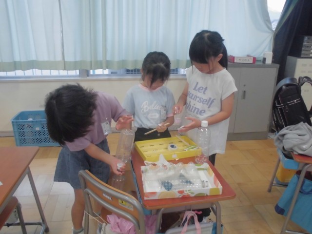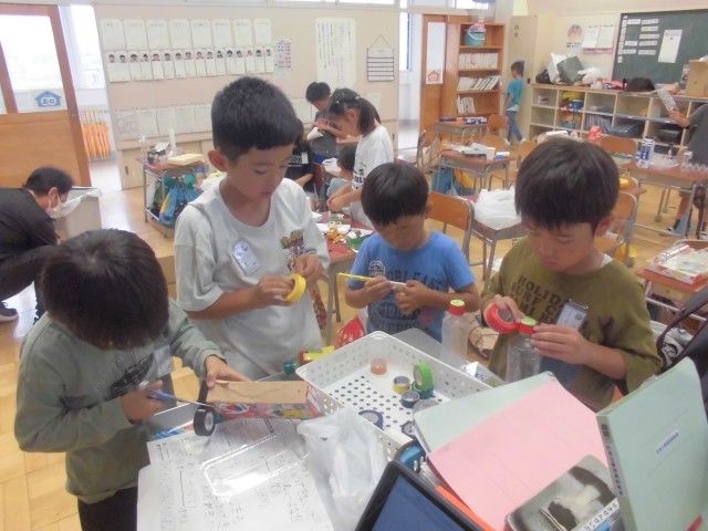 音が鳴るおもちゃを作ります。色を塗ったり、テープを巻いたり、思いっきり振ってみたり、夢中にならないわけがありません。