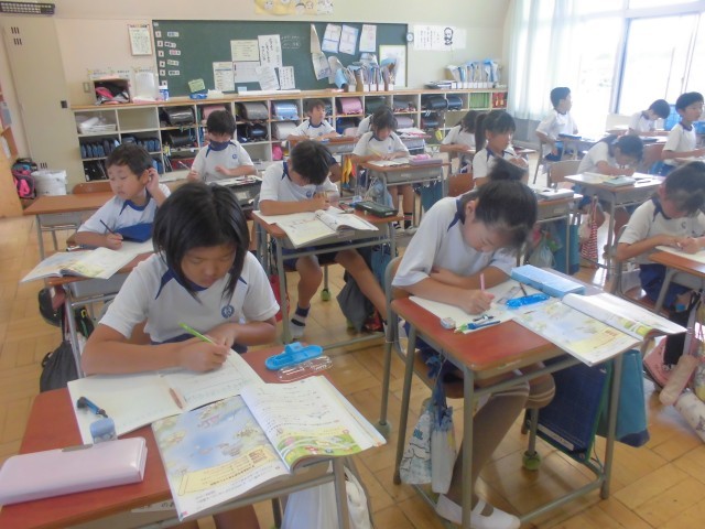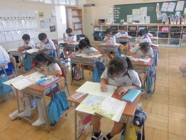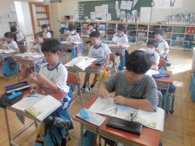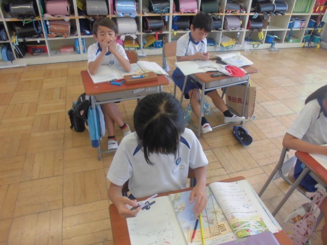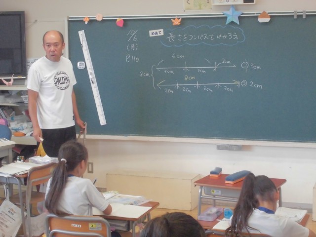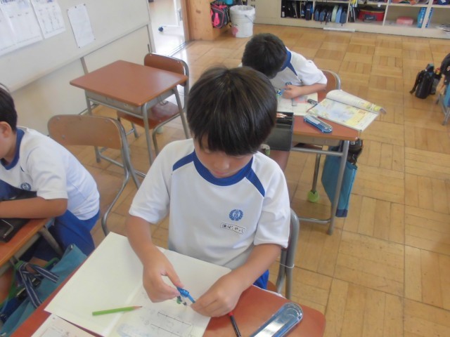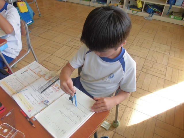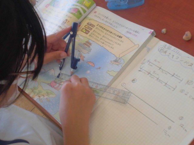 長さを測るのにコンパスも使えます。ノートに定規で直線を引いてから、コンパスでも確かめてみます。