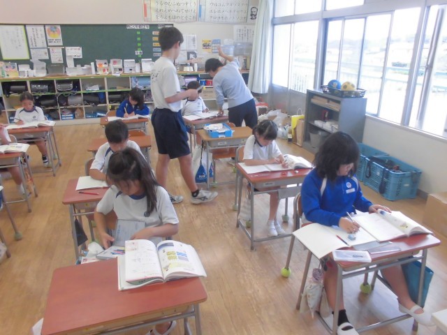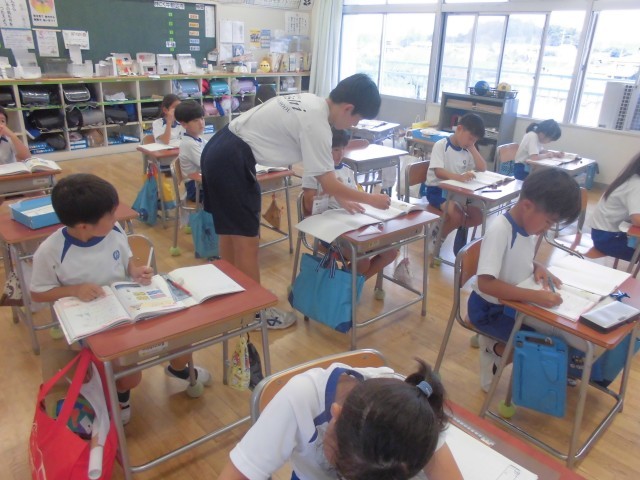 課題が仕上がると挙手して先生を待ちます。チャレンジウィークの中学生もマルをつけてくれます。