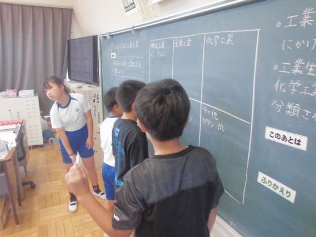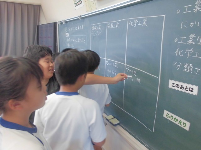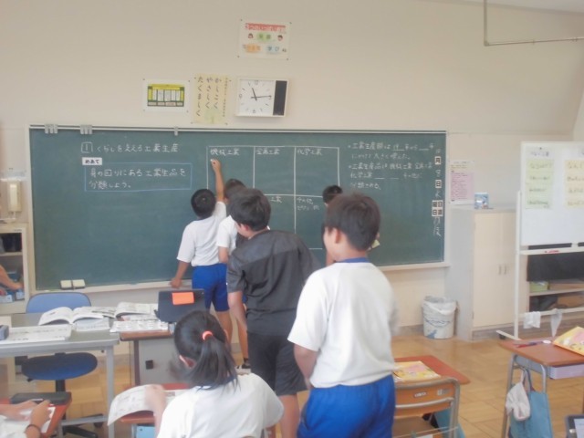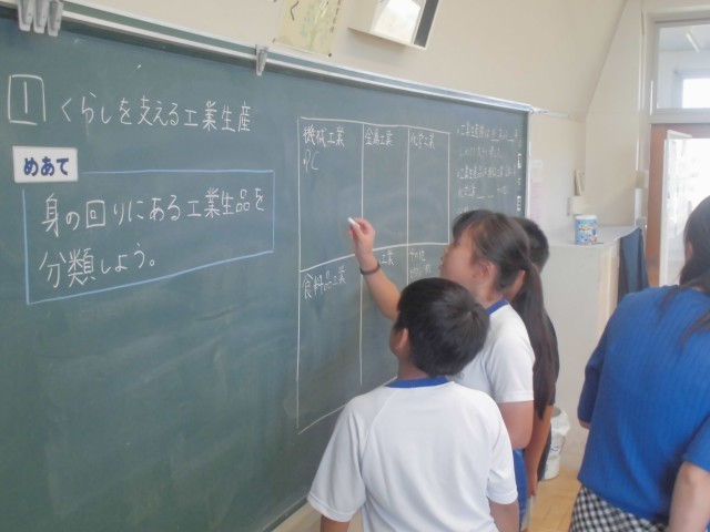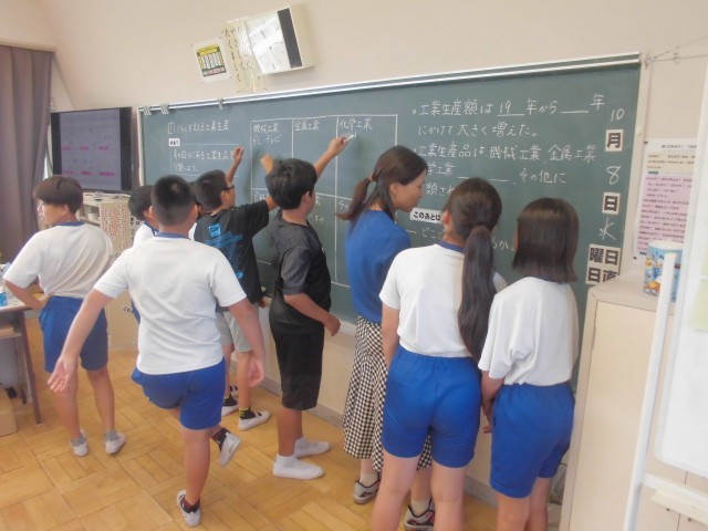 10月8日(水)5年生 社会 公開日 2025/10/08 更新日 2025/10/08 できごと 工業製品をどのような観点で分類するか確認し合った後、実際にさまざまな製品を黒板で6グループに分けてみました。 +5
