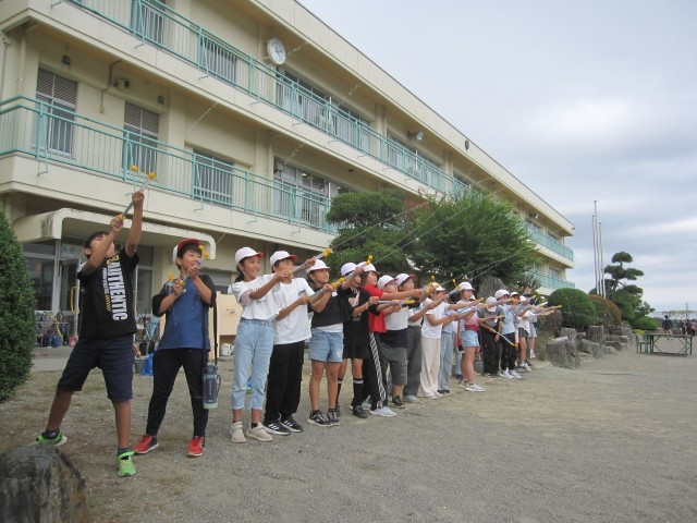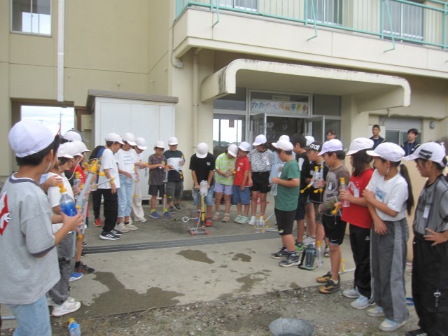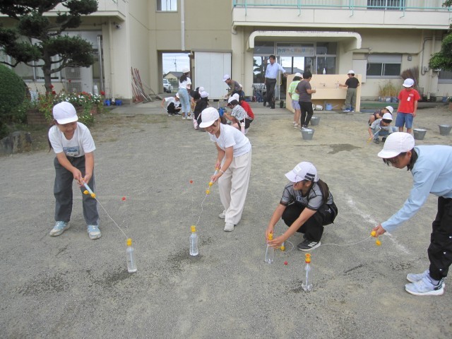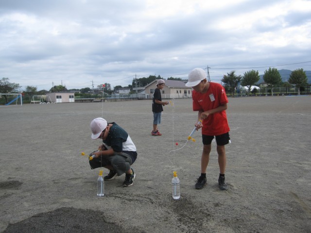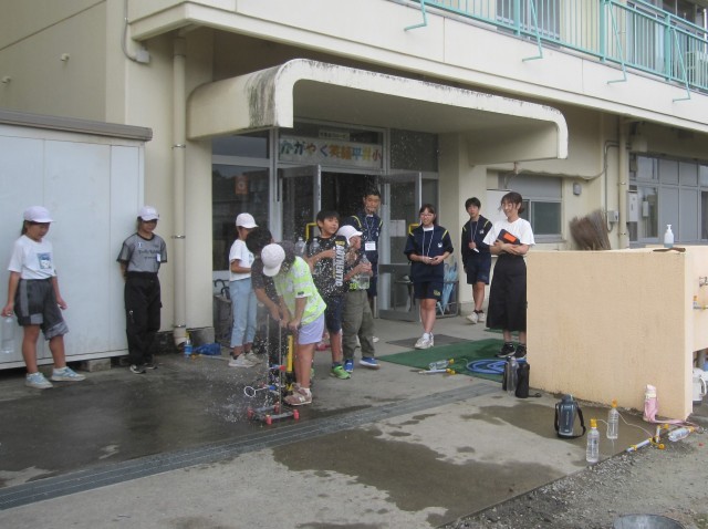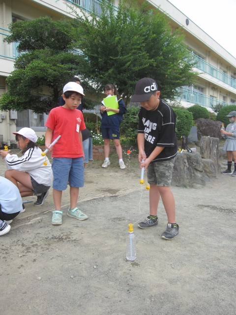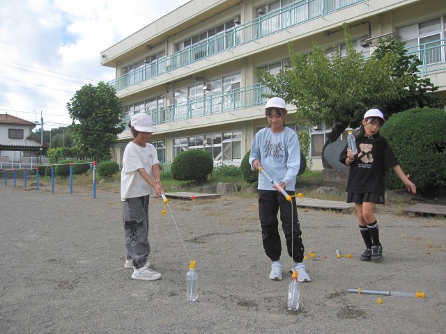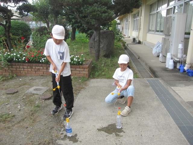 10月9日(木)4年生 理科 公開日 2025/10/09 更新日 2025/10/09 できごと 水鉄砲や噴水、ペットボトルロケットで遊びました。 ペットボトルにとじこめられた空気をおしちぢめると、もとにもどろうとして水をおし出すことがわかりました。 +7