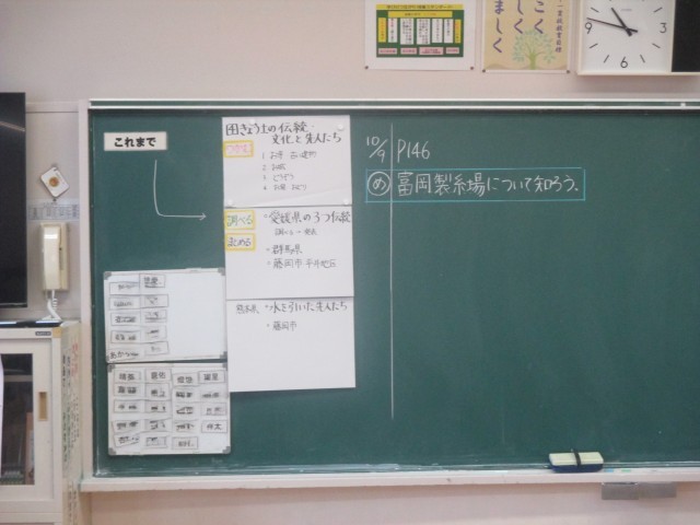 これまでの学習を確認し、本時より「富岡製糸場」について学習していきます。