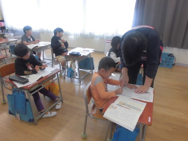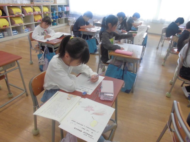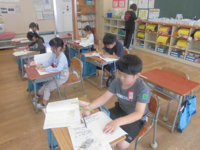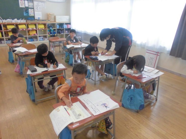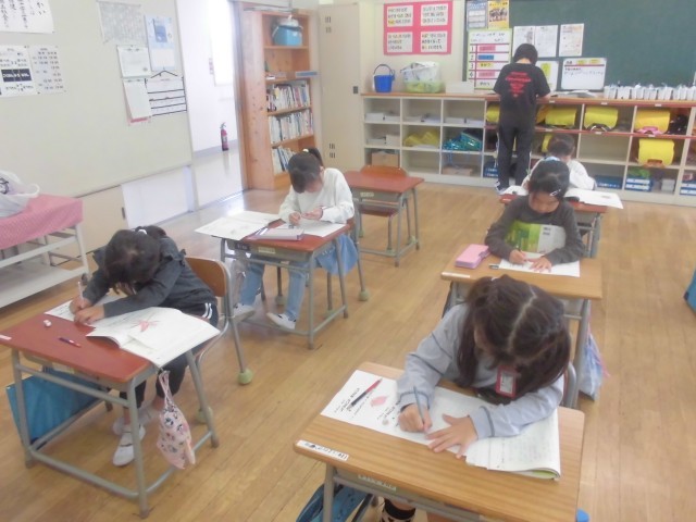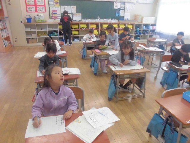 10月20日(月)1年生 国語 公開日 2025/10/20 更新日 2025/10/20 できごと 「自分の見つけた知らせたいこと」をイラスト入りの下書きを見ながら、原稿用紙に清書している場面でした。 +3