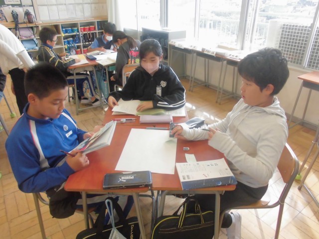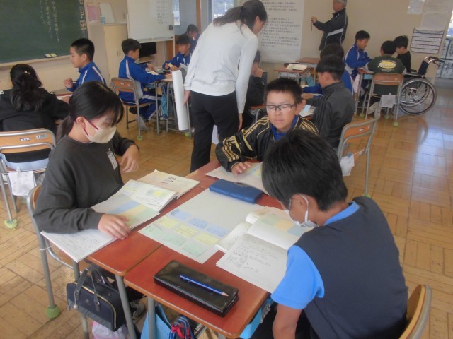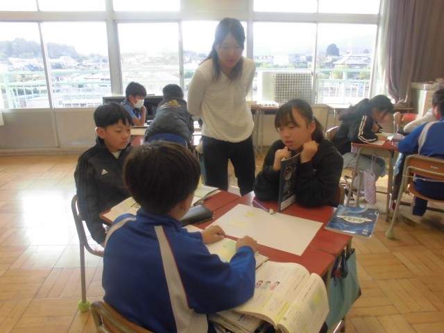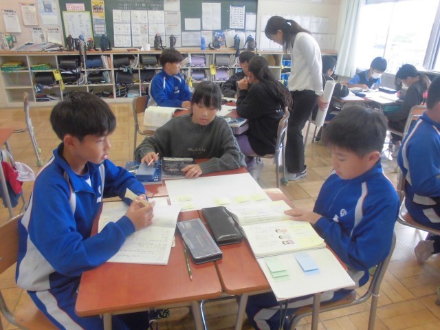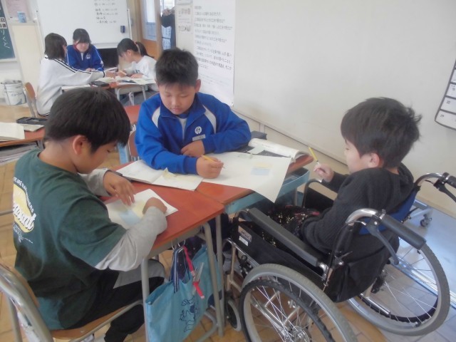 日野小の5年生と合同です。前回の個々の付箋を持ち寄って、本時は班ごとにまとめていきます。