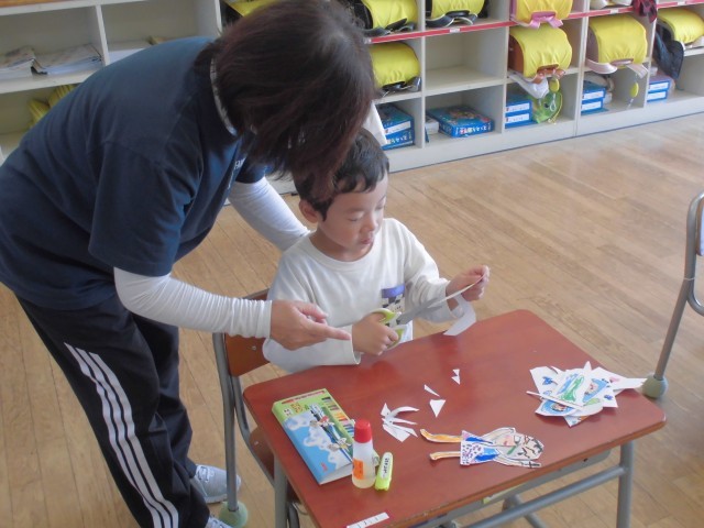 交流学級で、絵を切り抜く図工、ボール投げの体育、調べ学習の理科のようすです。