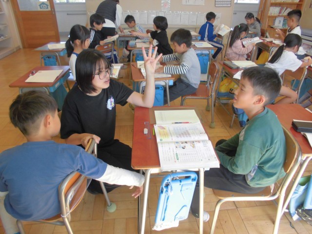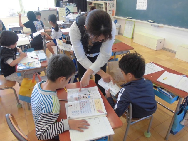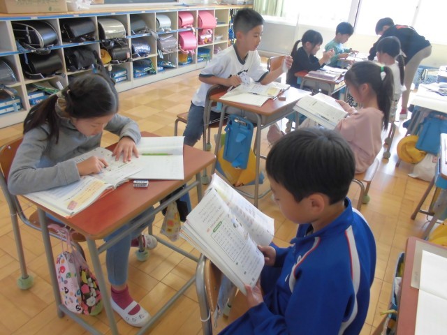 ペアでかけ算九九を練習し合っている場面でした。計算の基本の九九はバッチリ習得したいですね。