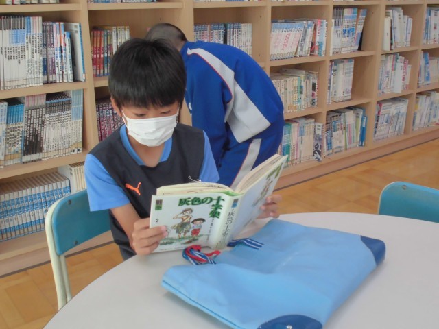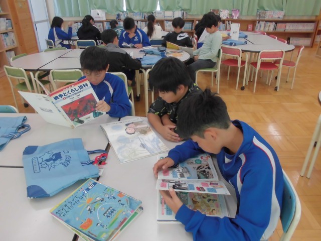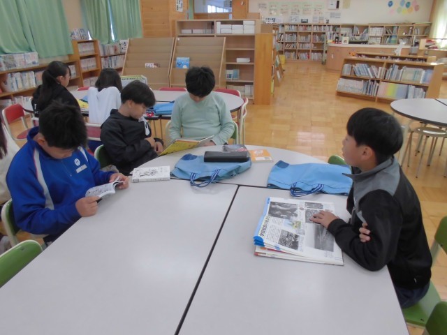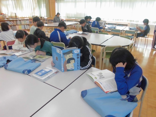 図書室で戦争についての文献を読み、知識の幅を増やします。真剣に調べ学習ができました。