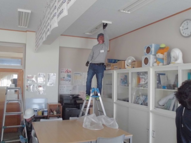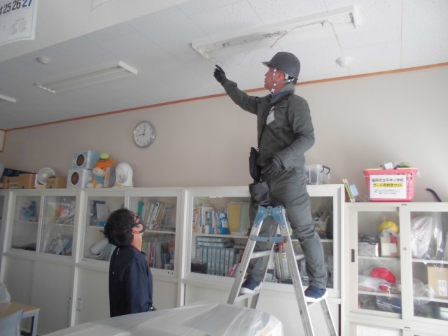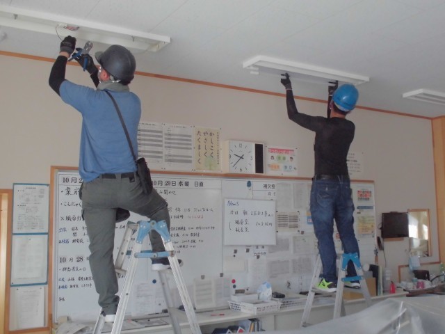 10月27日(月)電灯LED化工事 公開日 2025/10/27 更新日 2025/10/27 できごと 学校もいよいよ蛍光灯からLEDに変換する工事が始まりました。節電になり、しかもとても白く明るくなりました。