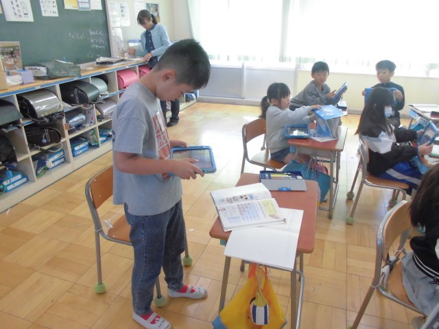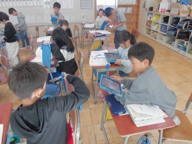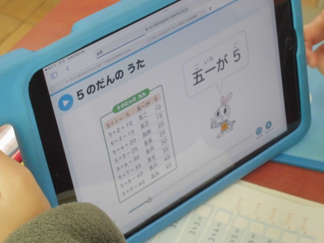 教科書のQRコードをタブレットで読み込むと、かけ算九九の5の段の覚え歌が流れます。