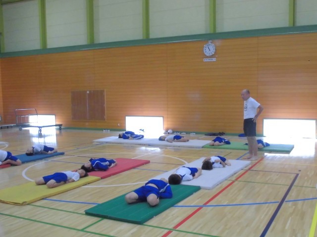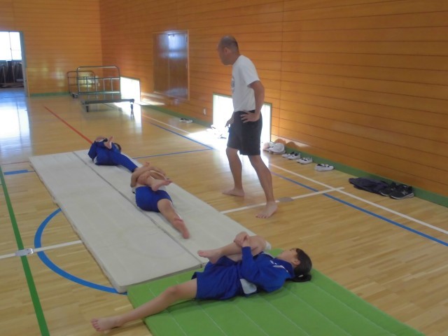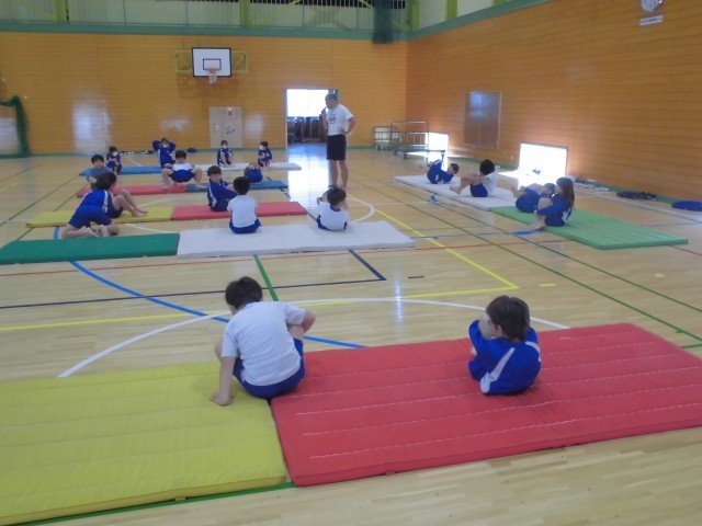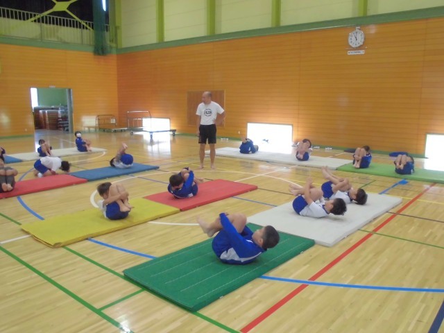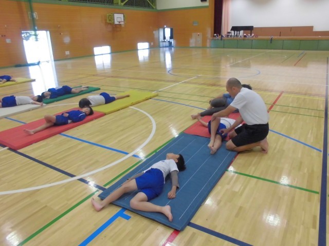 マット運動の前に、けがをしないよう入念にストレッチをしておきます。