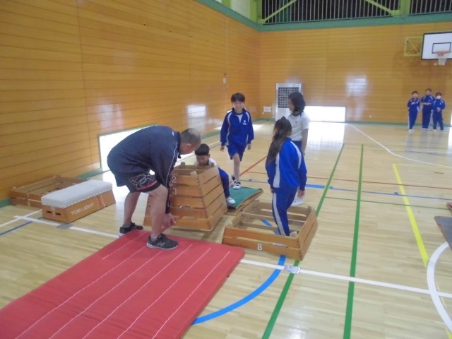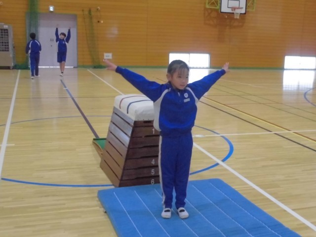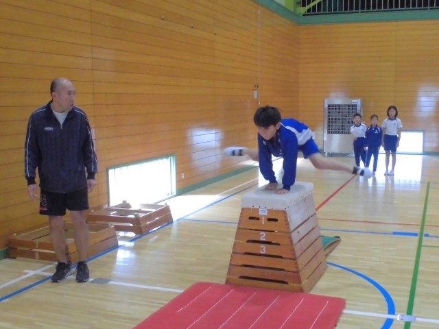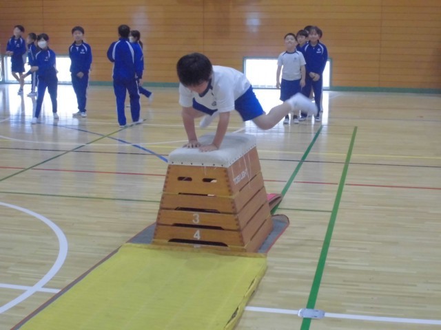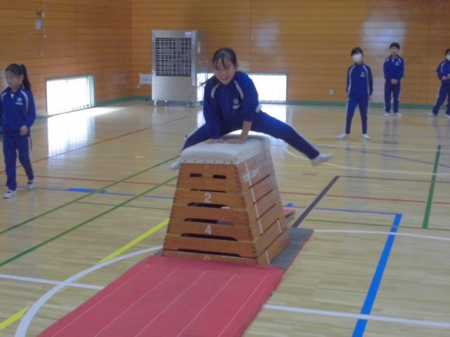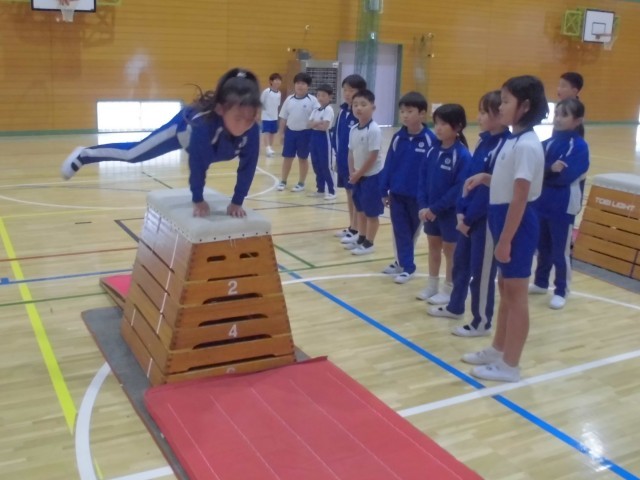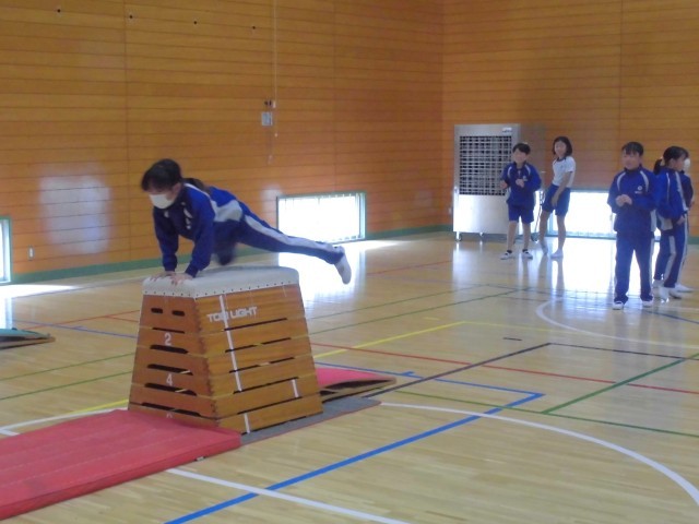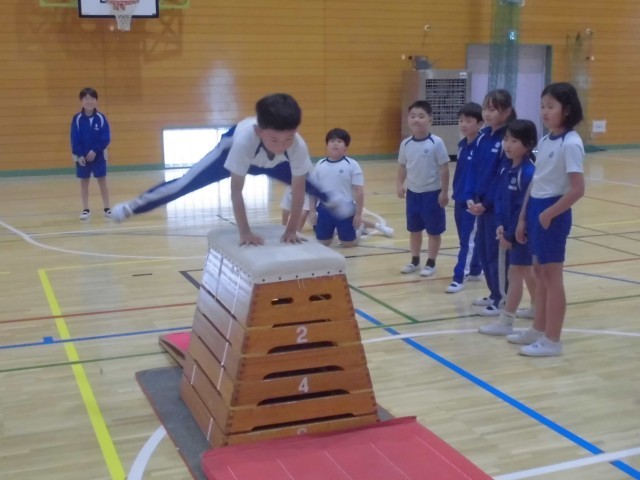 得意な子どもがお手本を示し、それぞれ自分の挑戦したい高さの跳び箱で練習を開始します。