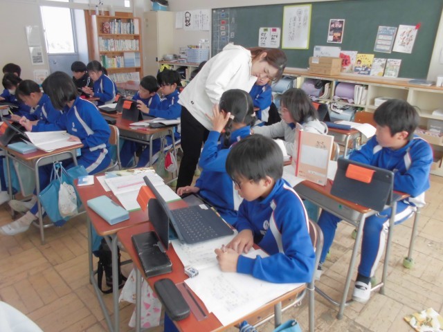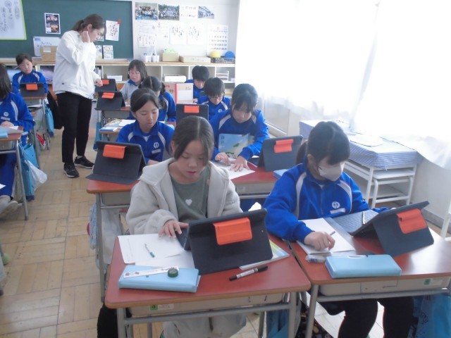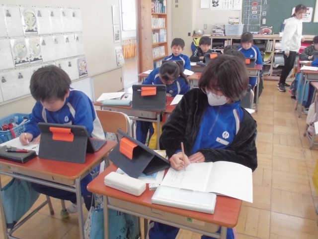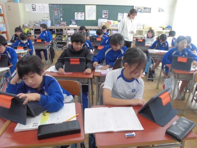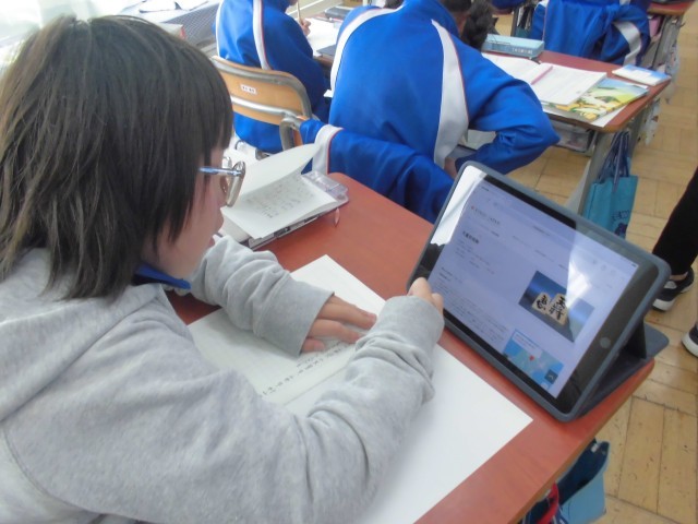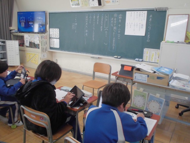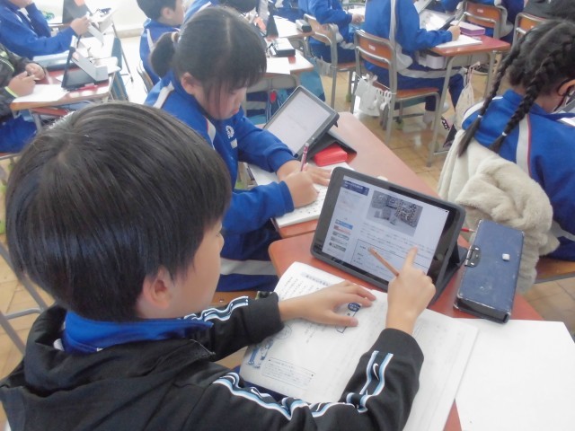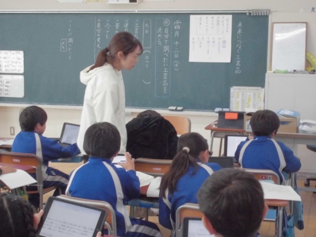 日本の工芸品について、自分たちでも興味をもった工芸品を一つ決めて、タブレットで調べ学習です。