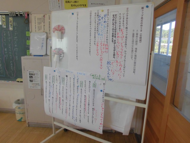 説明文に入りました。拡大印刷した文章をみんなで見ながら、文の構成について分析していきます。