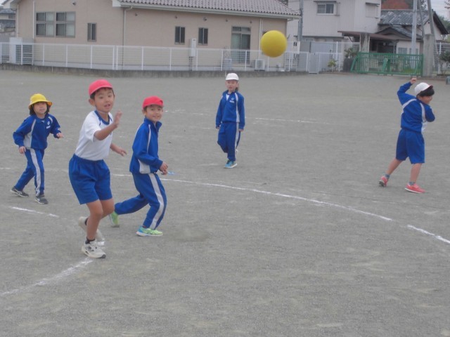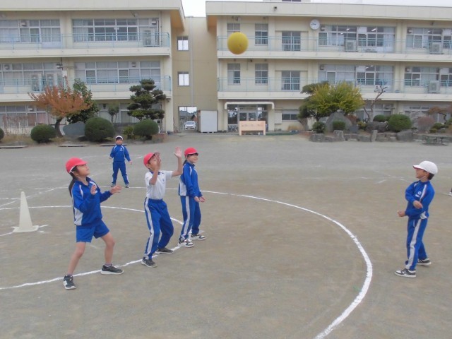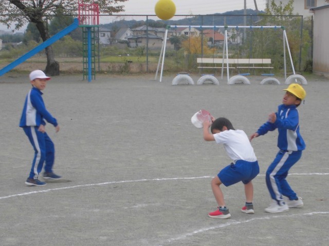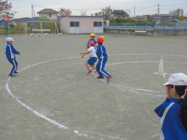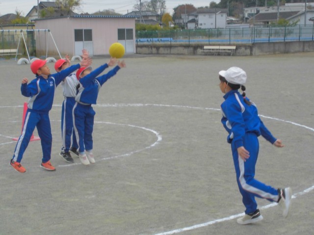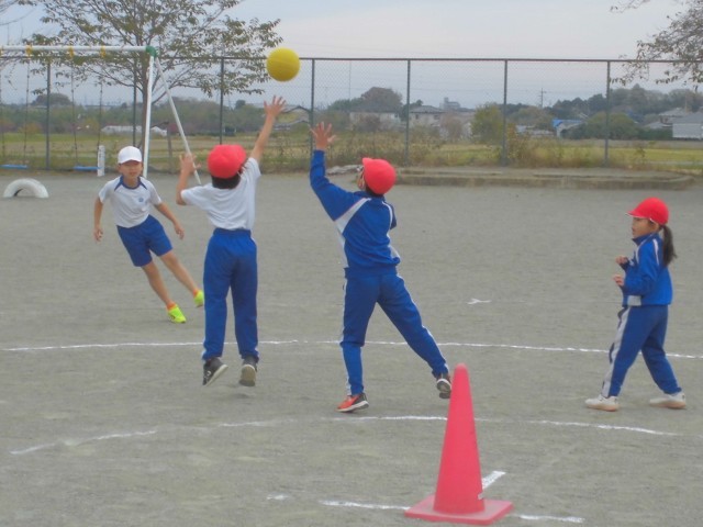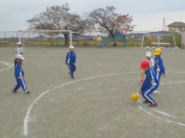 ドッチボールの基本バージョン、パスを回しながら中央のコーンを狙います。コーンに当てると得点になるので、赤帽子のデフェンスがそれを阻止します。