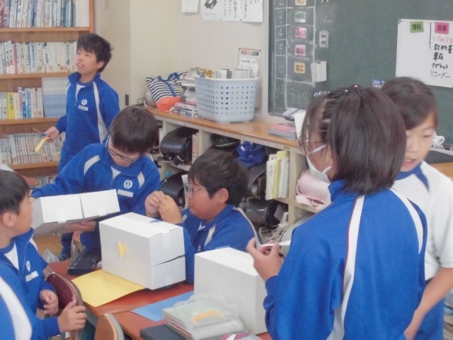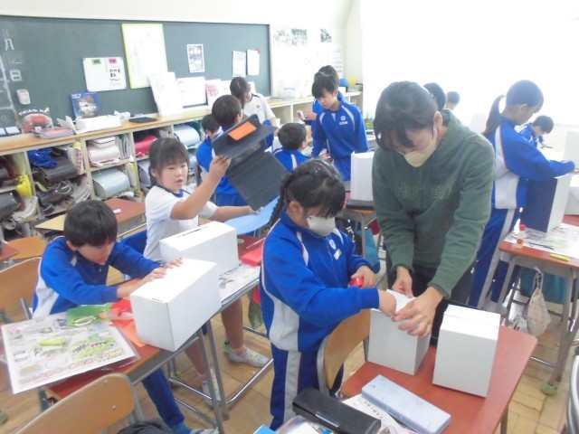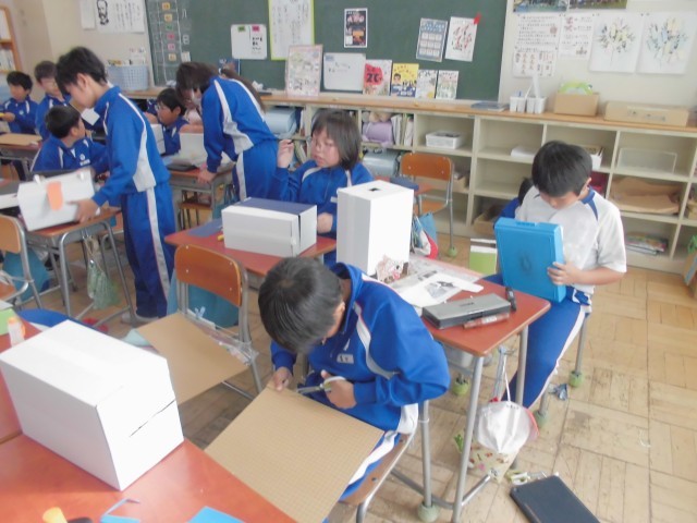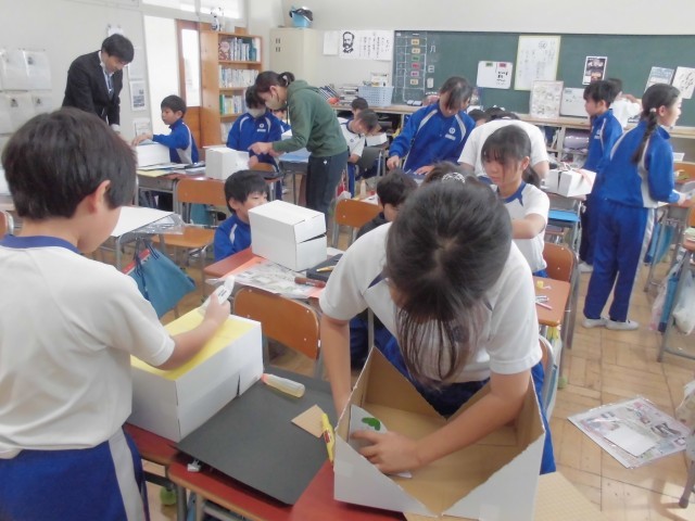 同じ大きさの段ボール箱をもとに、パッケージや中身をアレンジして段ボールアートを楽しみます。