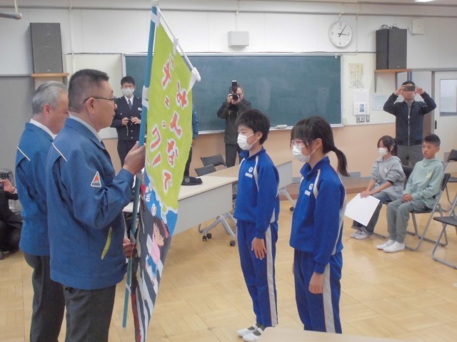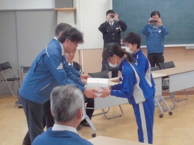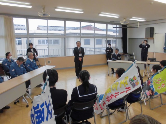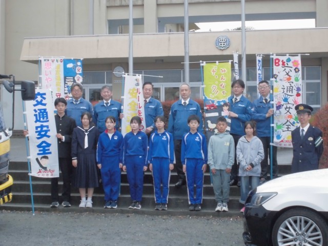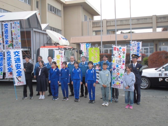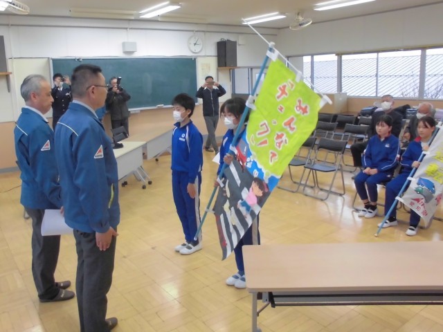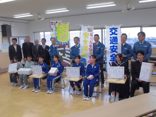 校区内の運送会社、愛知陸運(株)様より依頼のあった「交通安全のぼり旗」を贈呈したところ、西中学校に於いて感謝状と記念品をいただきました。一貫校から各校の代表が参加し、同席された愛知陸運の社長さんや役員さん、群馬県トラック協会の代表の方、藤岡警察署交通課長さんとも一緒に記念写真を撮りました。子どもたちのほのぼのした作品が交通安全に効果が高いそうです。