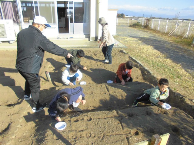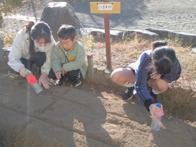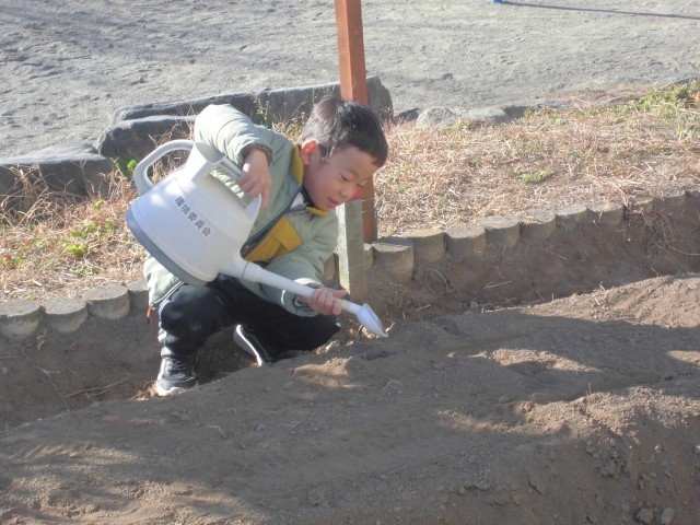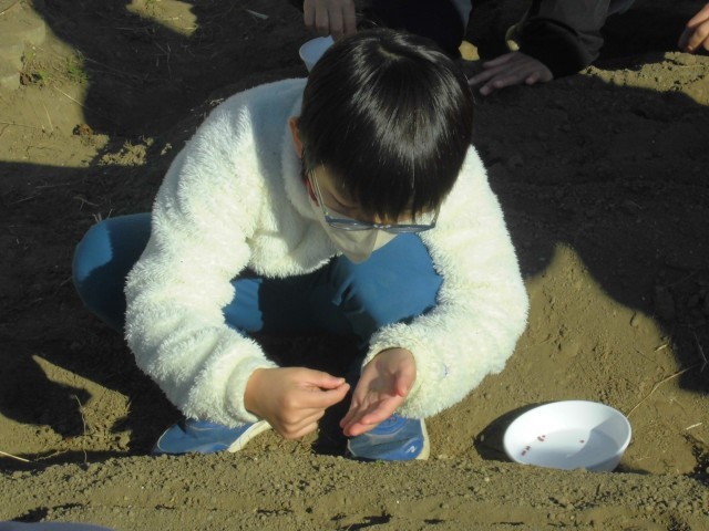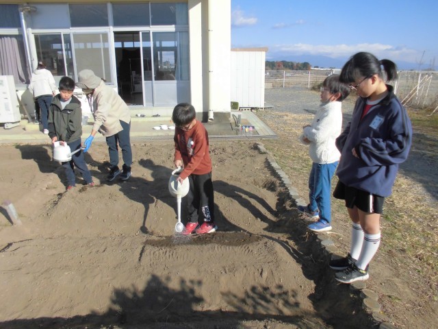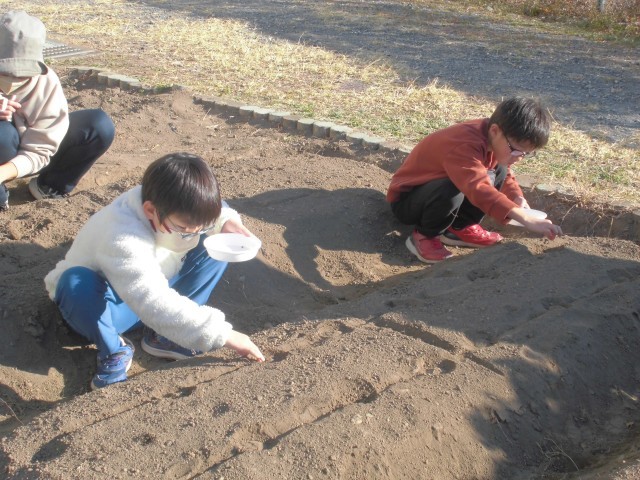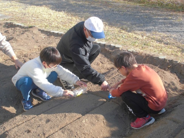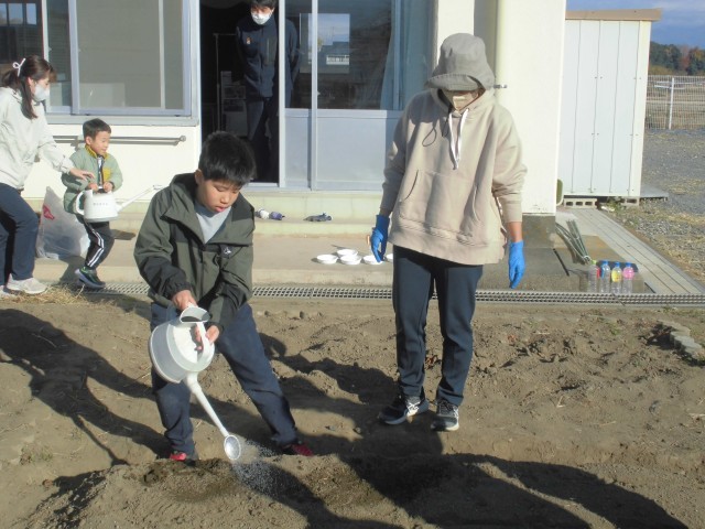 11月28日(金)ひまわり 生活 公開日 2025/11/28 更新日 2025/11/28 できごと 学級園にダイコンの種を蒔きました。専用ペットボトルで間隔と深さを調節し、決められた自分の担当場所に種を蒔きました。芽が出てくるのが楽しみです。 +7