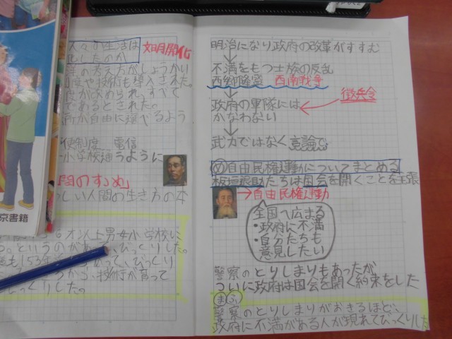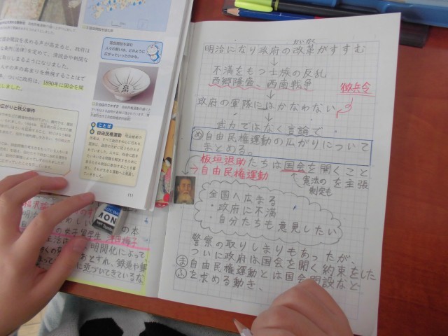 学習内容を終え、それぞれがノートにまとめをしている段階でした。みんな、分かりやすくまとめられています。