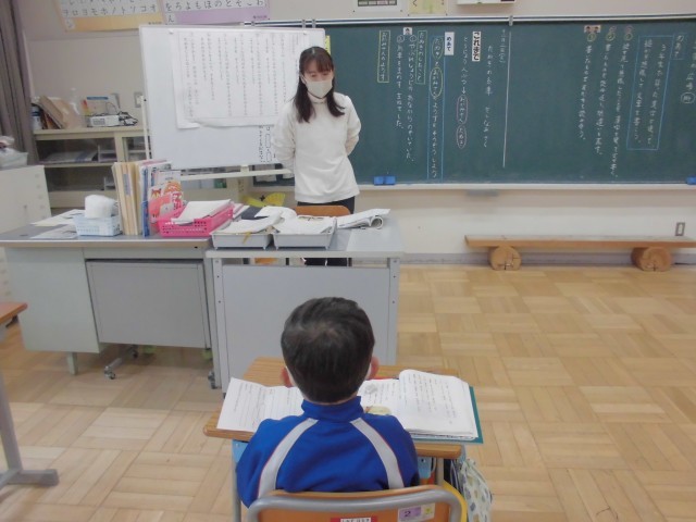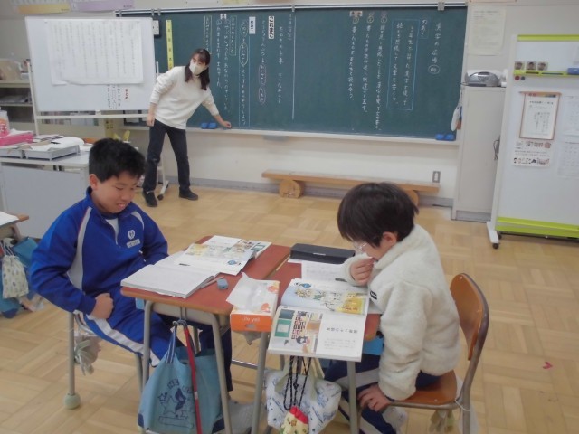 ふた学年の板書がきれいに示され、落ち着いた雰囲気で学習が進められています。