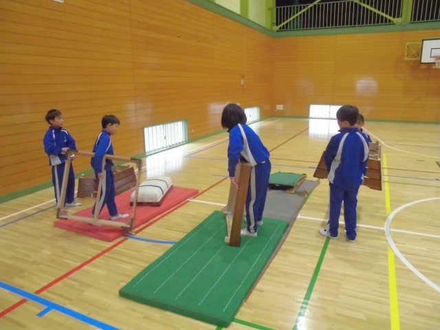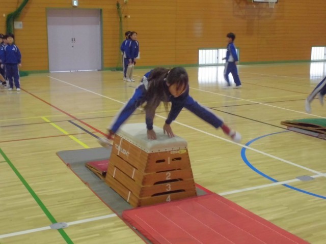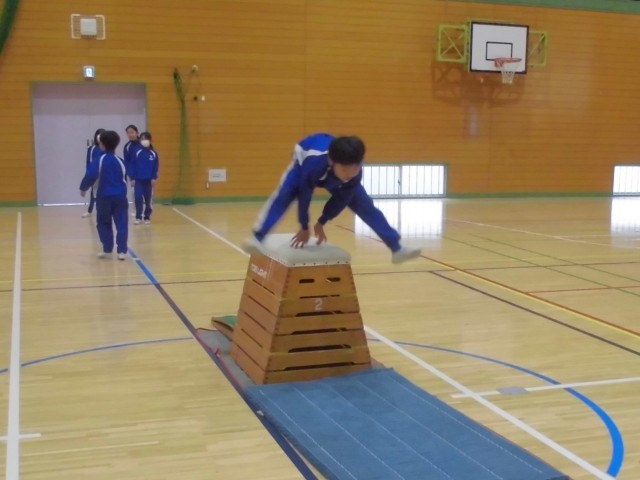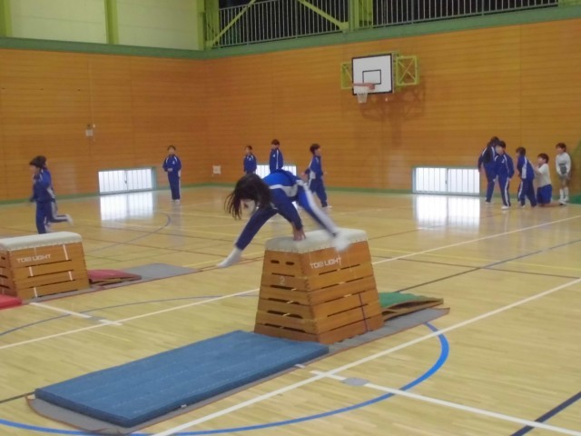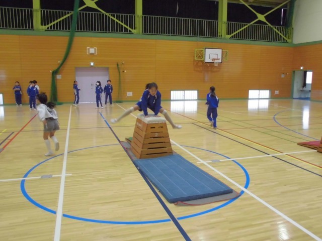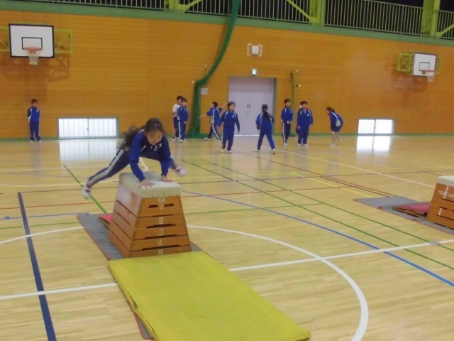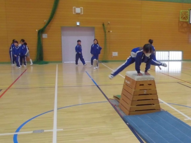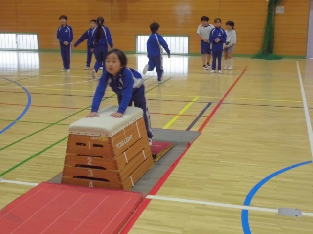 いろいろな高さの跳び箱にチャレンジします。ポイントをつかむと、高い跳び箱もきれいに跳ぶことができていました。