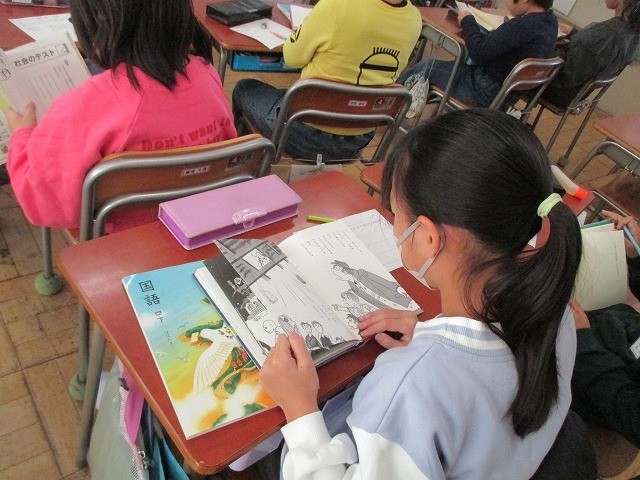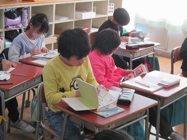 教科書で、本の内容の読み取り方(登場人物や情景、気持ちの変化など)を学んだあと、ミステリーものの読書を行って、友だちに紹介していきます。ミステリーものって、ついつい読み込んじゃいますね。子どもたちは学んだことを生かして、読書メモを残していきます。