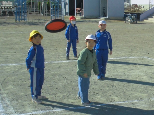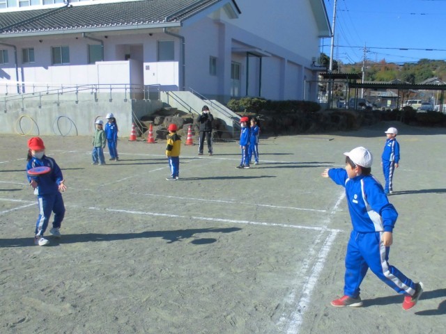 ボール投げの練習の後は、柔らかフリスビーと柔らかボールでドッチボールに挑戦です。