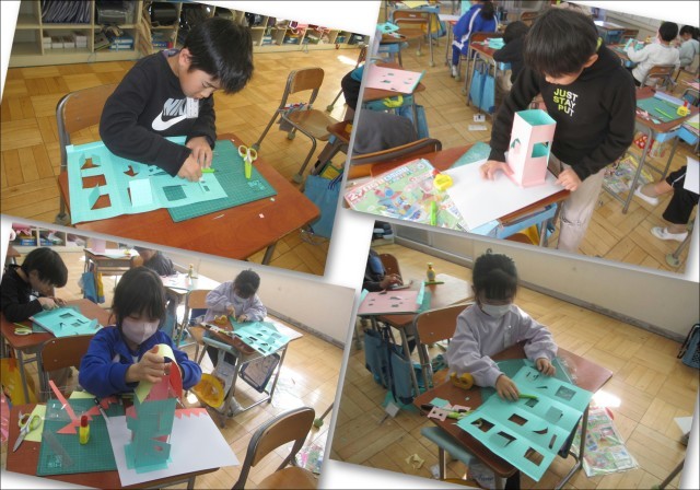 12月10日(水)2年生 図工 公開日 2025/12/10 更新日 2025/12/10 できごと カッターナイフで切ってまどを開ける「まどをあけたら」という題材です。初めてカッターナイフを使うので、安全に配慮しているいろな切り方を練習してから作品の制作にあたりました。 +1
