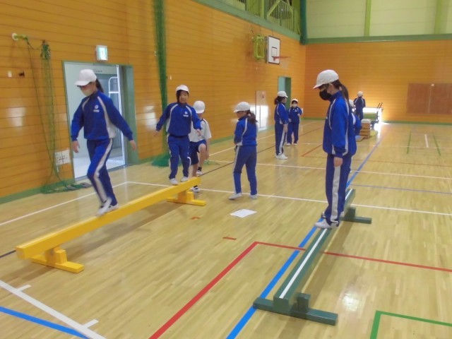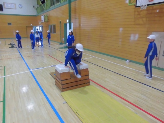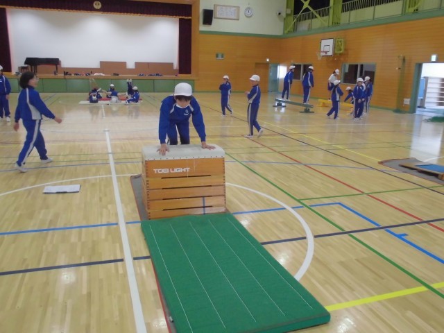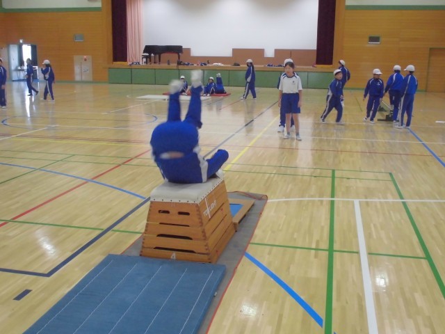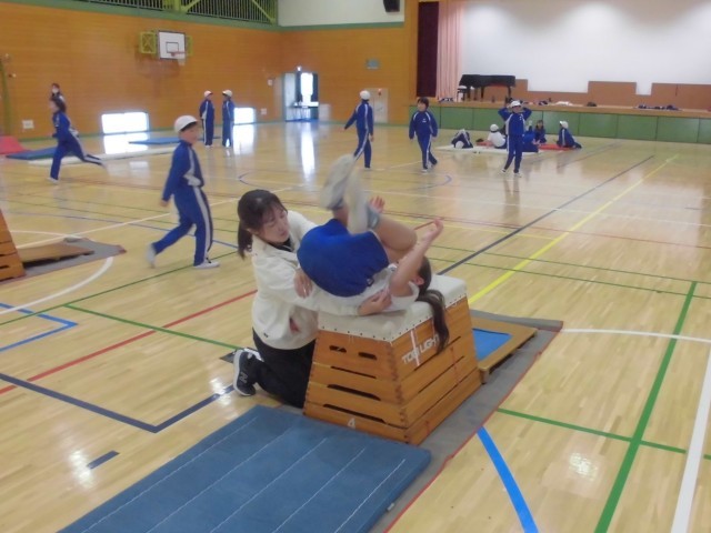 マットや跳び箱、平均台などを設定し、時間ごとにローテーションしながら効果的にどの種目も練習していきます。