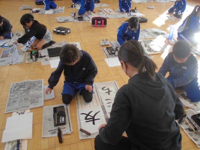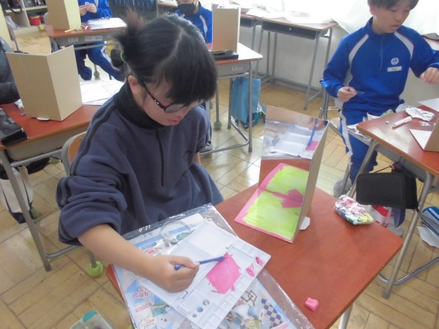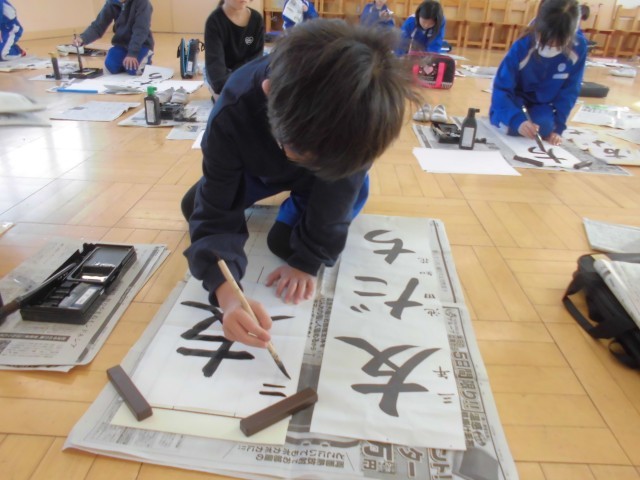 12月11日(木)ひまわり 書写&図工 公開日 2025/12/11 更新日 2025/12/11 できごと 交流学級で、書き初め練習の書写と鏡の図工の様子です。どちらも、きちんと助手さんが対応します。