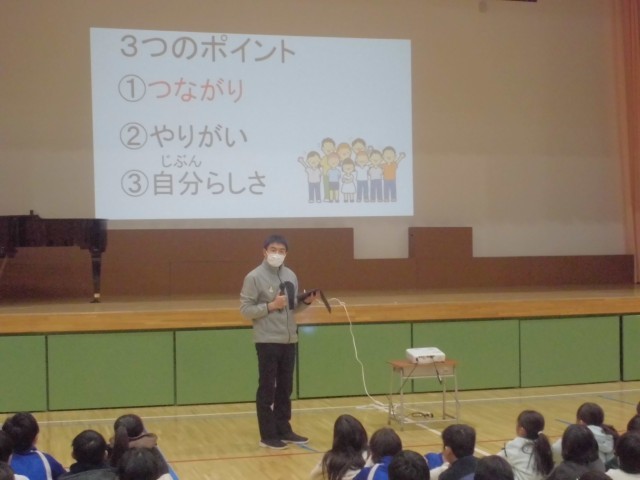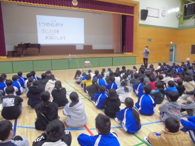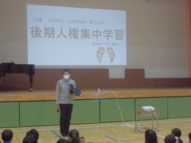 12月16日(火)人権集会 公開日 2025/12/16 更新日 2025/12/16 できごと 人権集中学習のまとめの話は教頭先生です。後半は12月が誕生日のお友達に、ハッピーバースデーの歌を贈りました。 +7