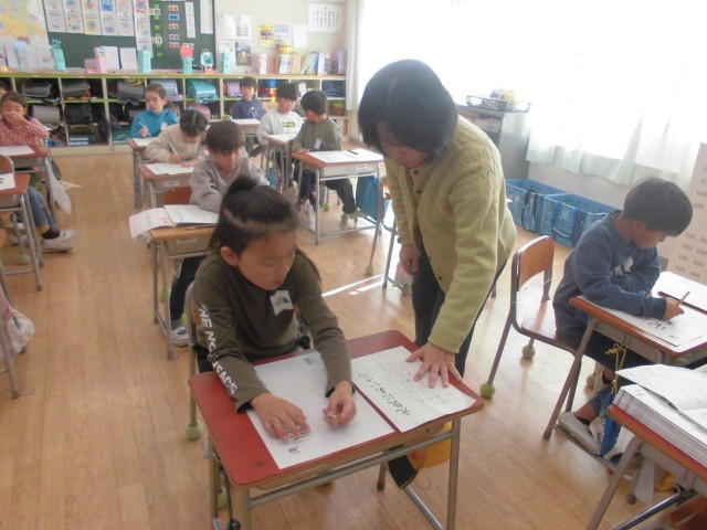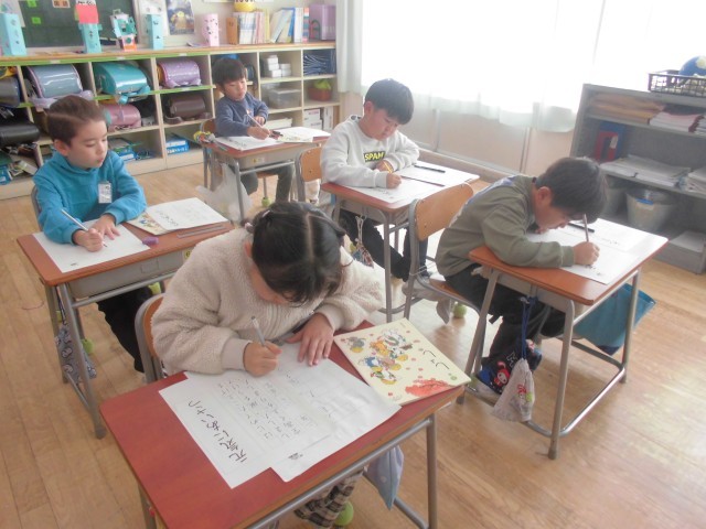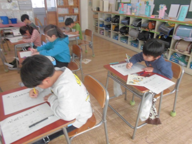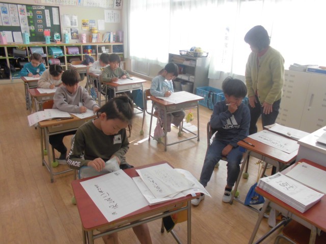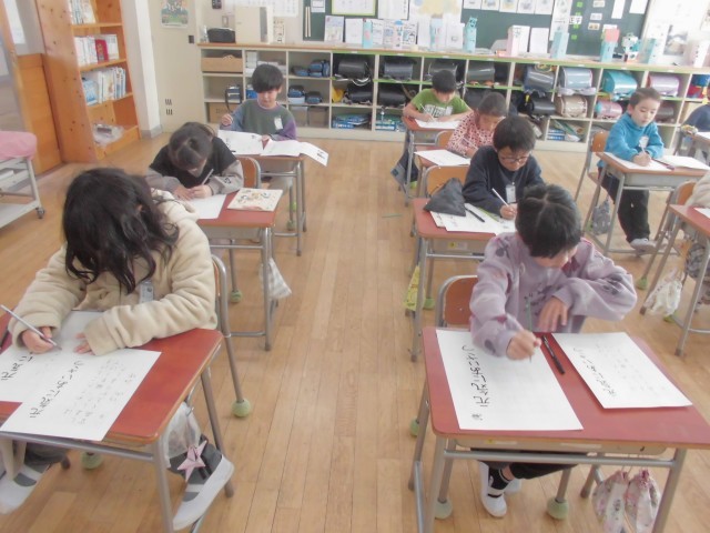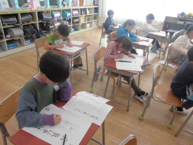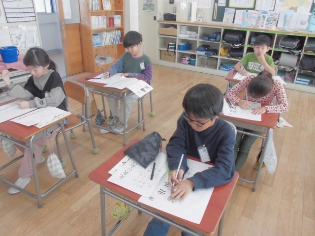 硬筆の書き初め練習です。お手本通り、ていねいに一文字一文字集中して書いていきます。