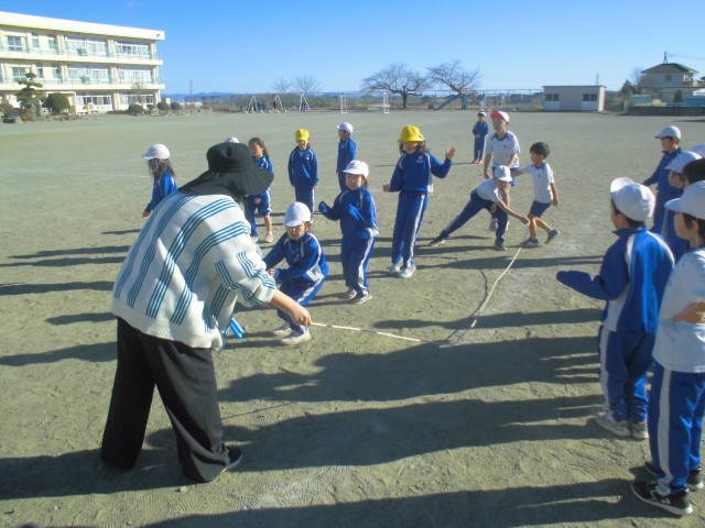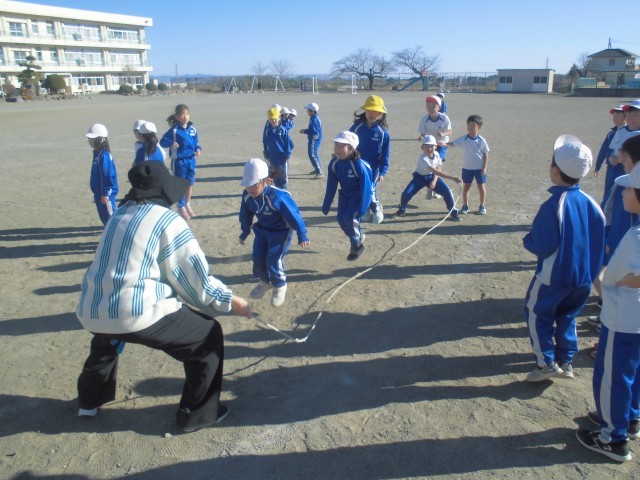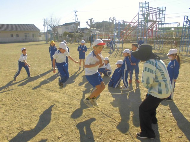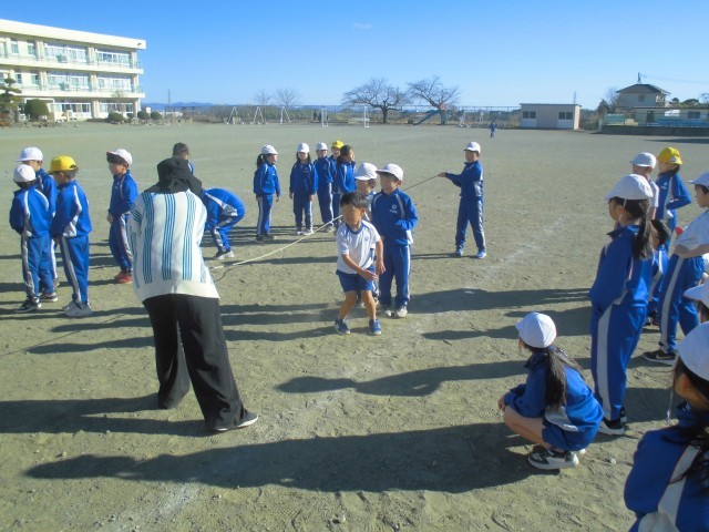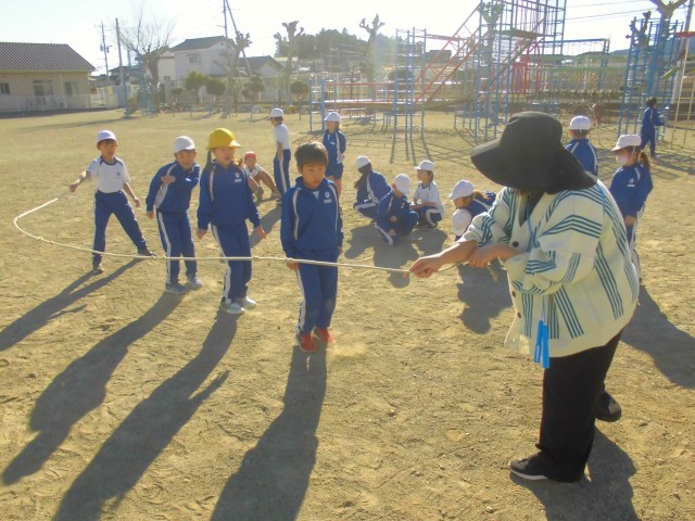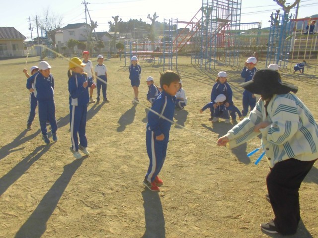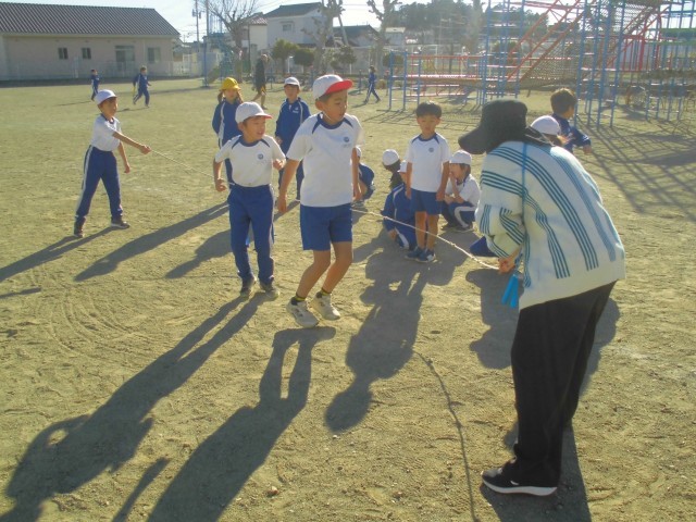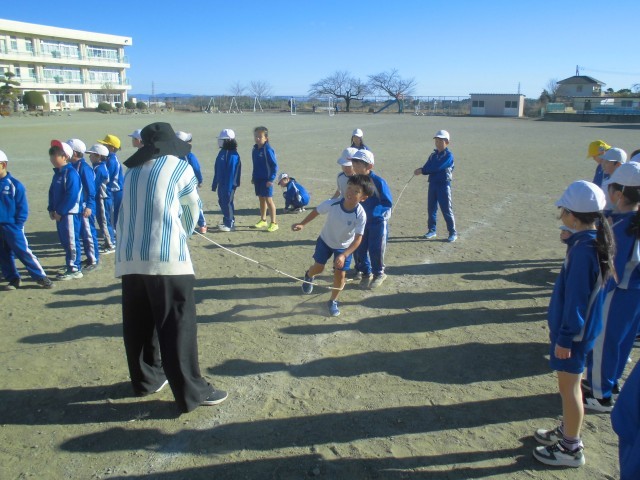 3人ずつ長縄の練習です。曲に合わせてリズムよく跳んでいきます。