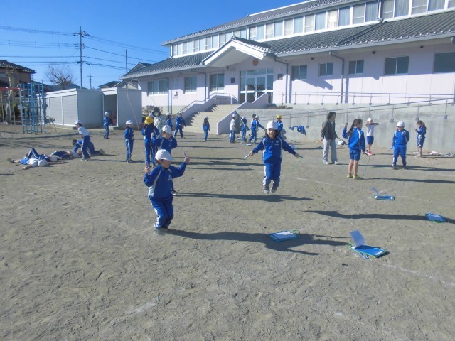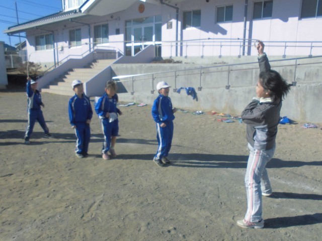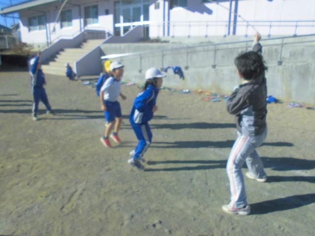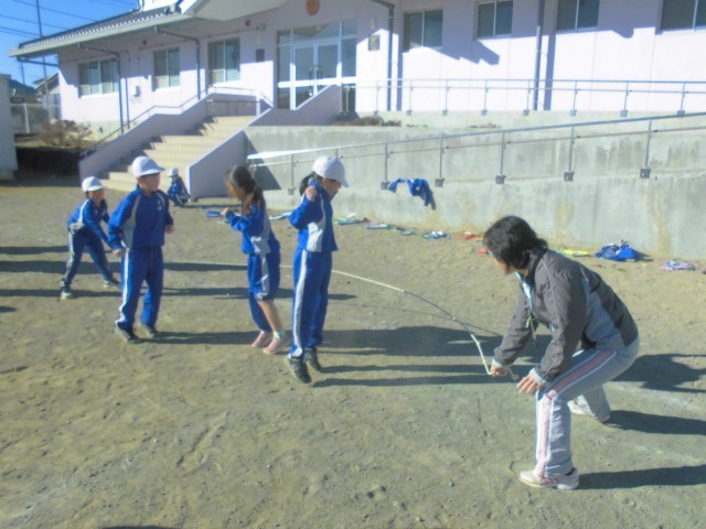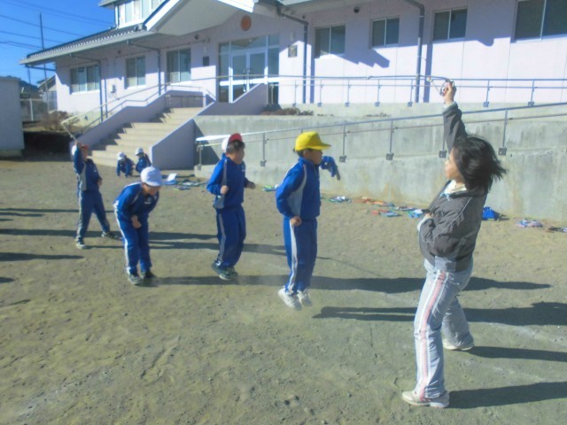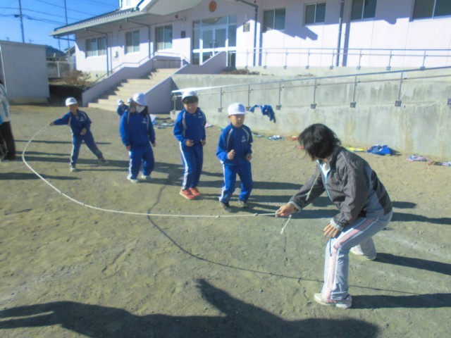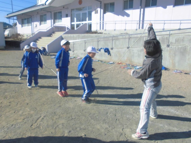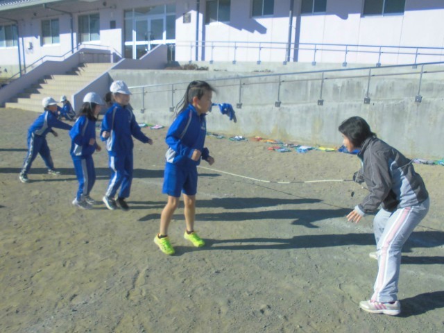 3人ずつ長縄の練習です。「郵便屋さん、お入んなさい…」と歌いながら、リズムよく跳んでいきます。
