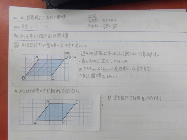 平行四辺形の面積の求め方を考えます。ノートに平行四辺形の図を3つ貼り3パターンほど考え、その考えを共有して公式を求めていきます。
