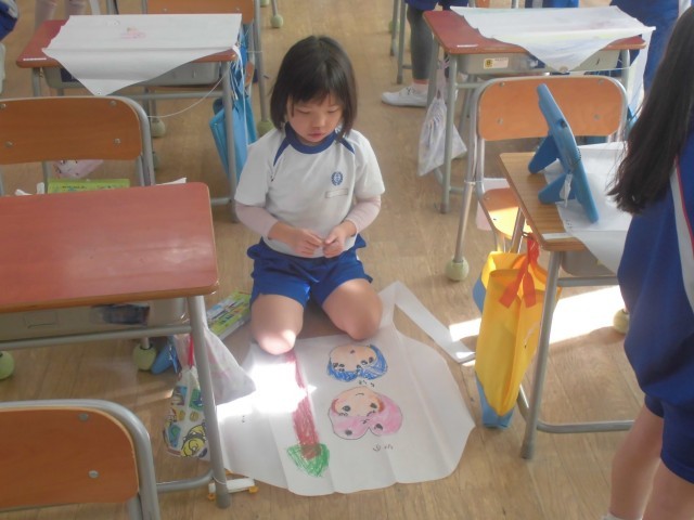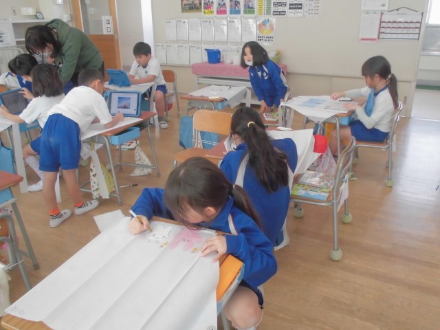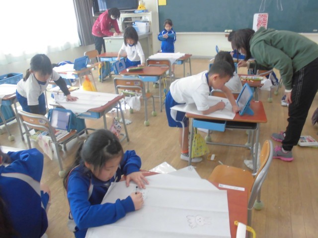 真っ白なタコに、思い思いの絵を描いていきます。タブレットで検索した具体物も参考にします。