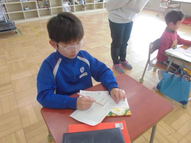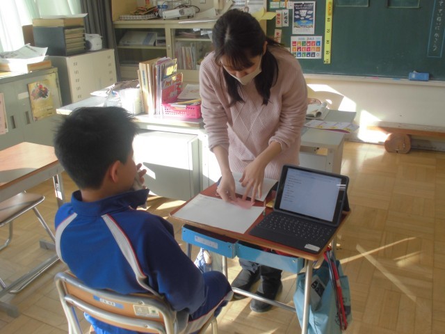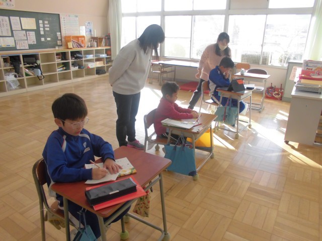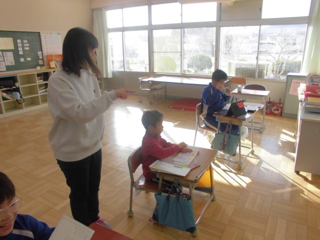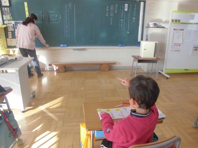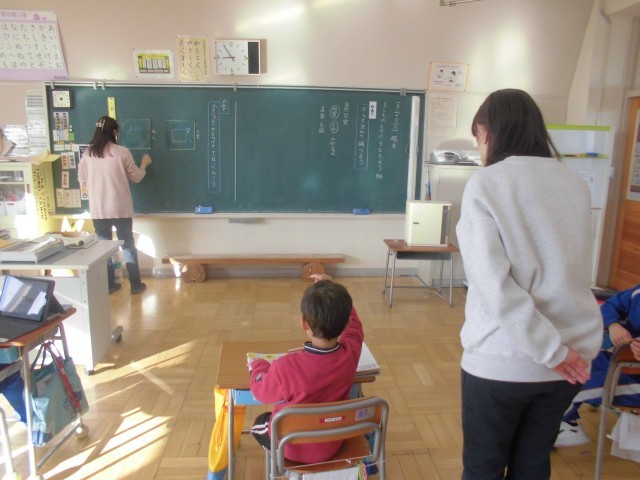 ふた学年同時に国語ですが、黒板をうまく分かて効率的に学習を進めていきます。
