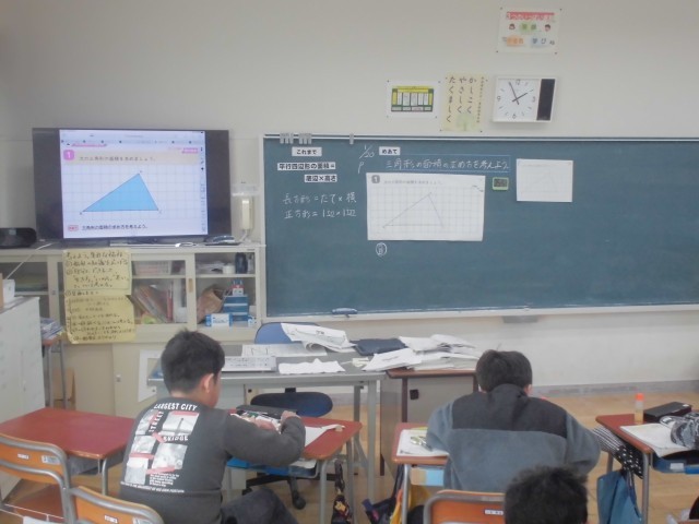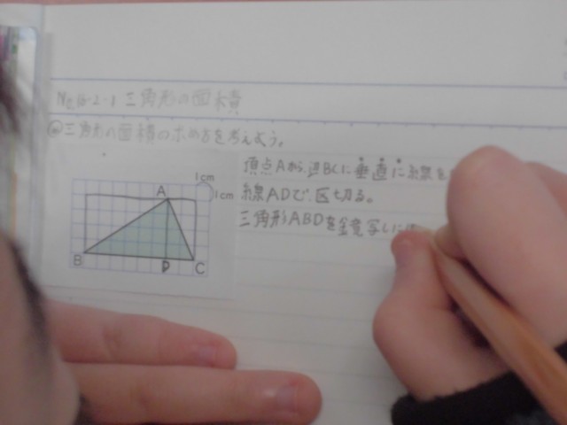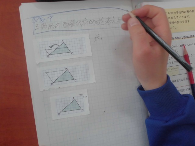 今回は三角形の面積の求め方を考えます。前回の平行四辺形の面積の公式が生かされています。