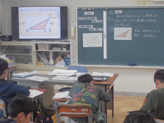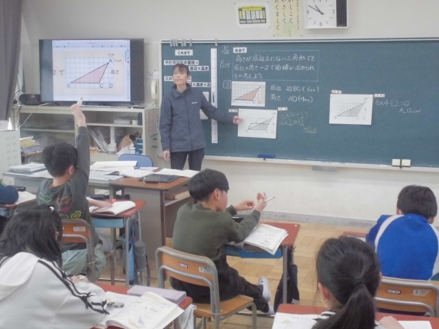 1月22日(木)5年生 算数 公開日 2026/01/22 更新日 2026/01/22 できごと 三角形の面積を求める公式を覚えたので、どんな三角形にも当てはまるのか?みんなで検証していきます。 +6
