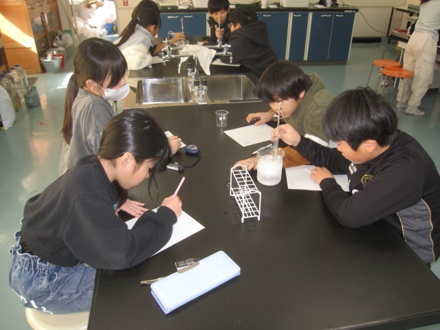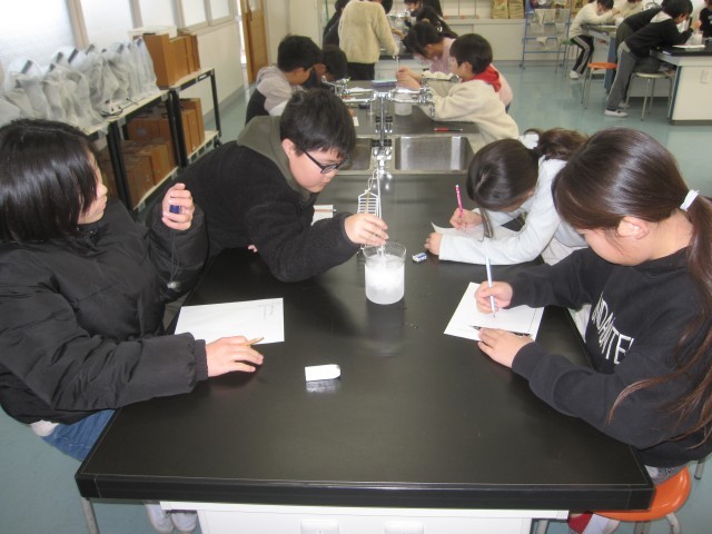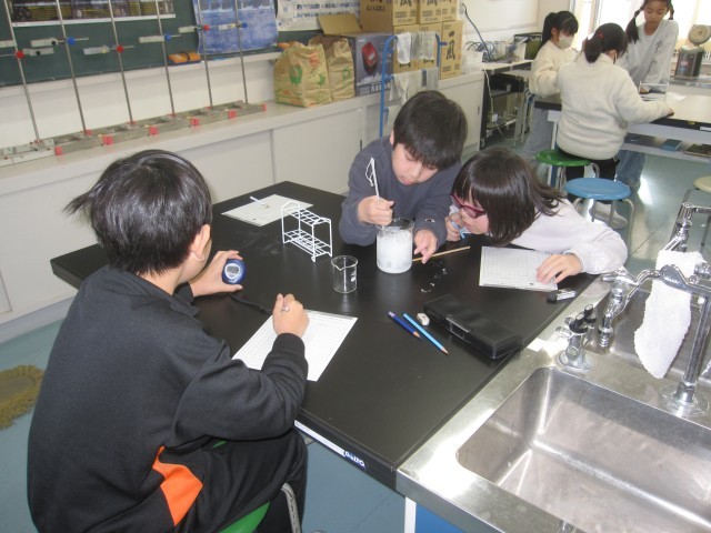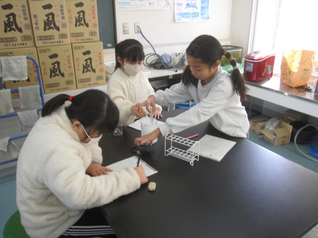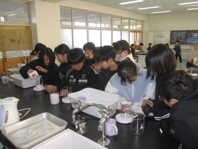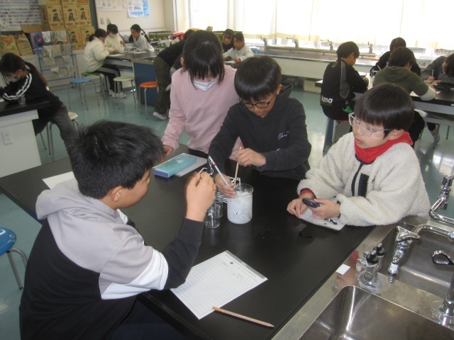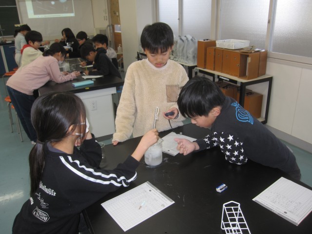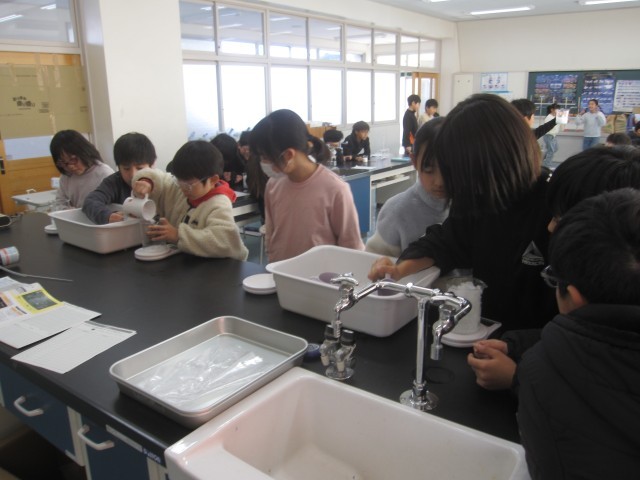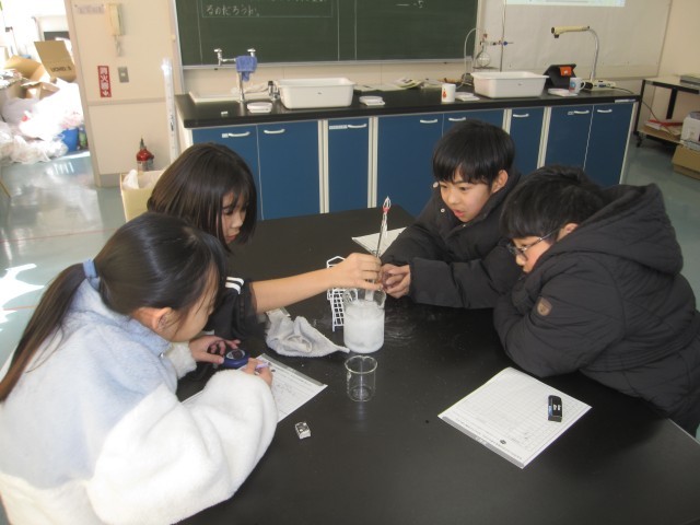 1月30日(金)4年生 理科 公開日 2026/01/30 更新日 2026/01/30 できごと 水を冷やしたときの温度の変わり方と、水のようすを調べました。 水は、冷やされて0°Cまで下がるとこおり始め、すべて氷になるまで、0°Cのままでした。すべて氷になった後、さらに冷やすと0°Cよりも下がりました。また、水は、氷になると体積が大きくなることもわかりました。 +7