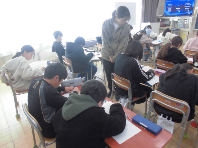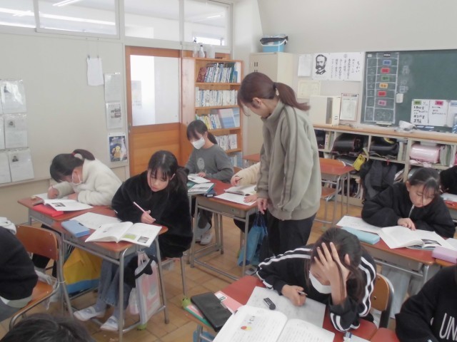 いつも黒板のはじめには学習計画が示されています。各段落からキーワードを書く抜く作業中ですが、先生が常にアドバイスして回ります。