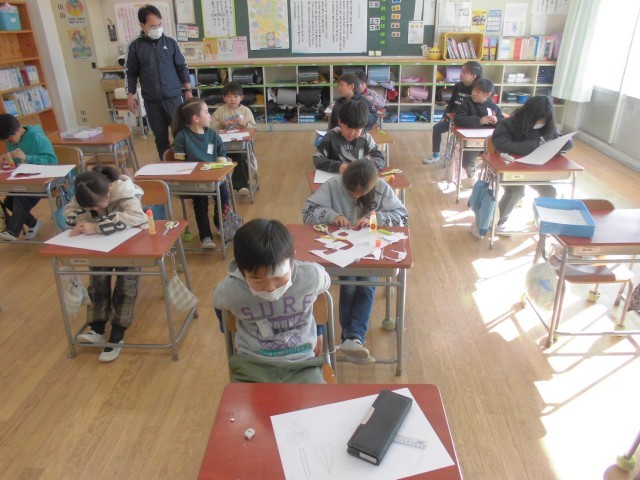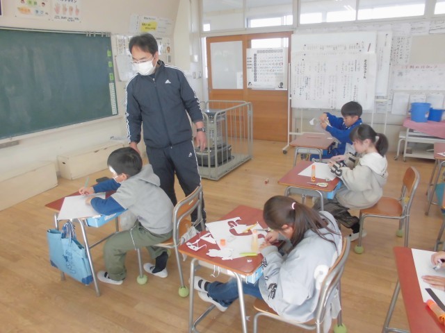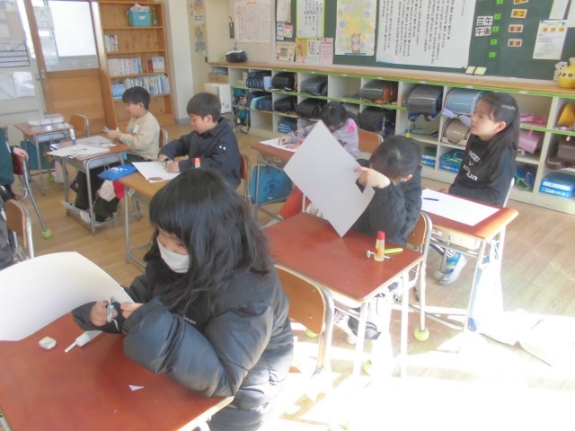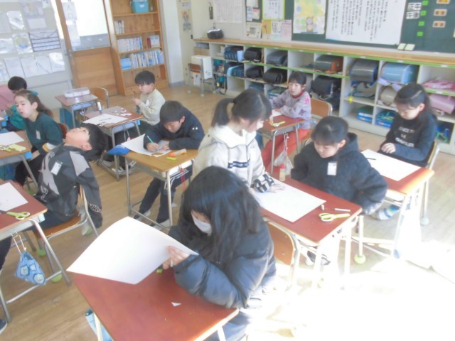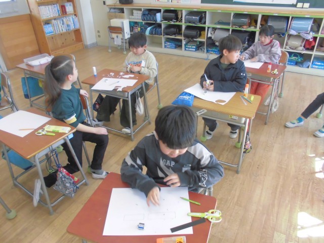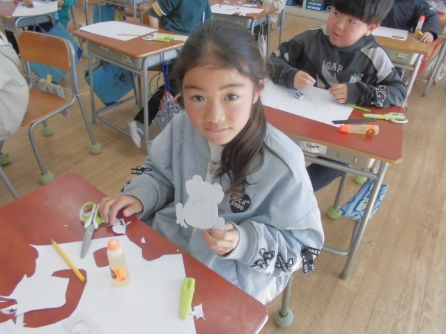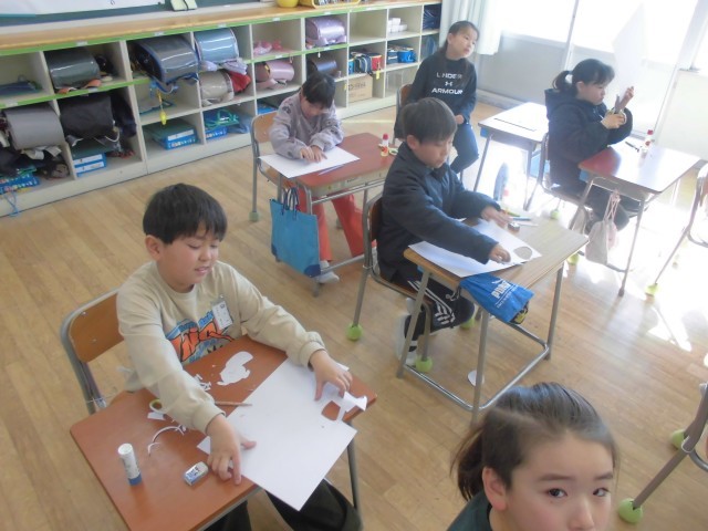 紙版画の1時間目です。効果を考えながら、素材を切って、重ねて貼っていきます。