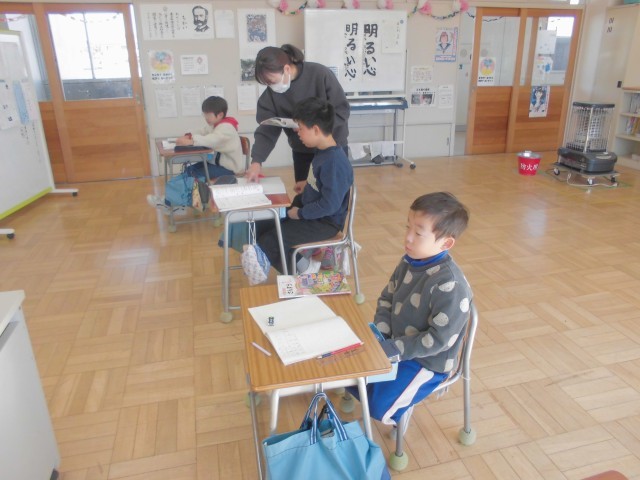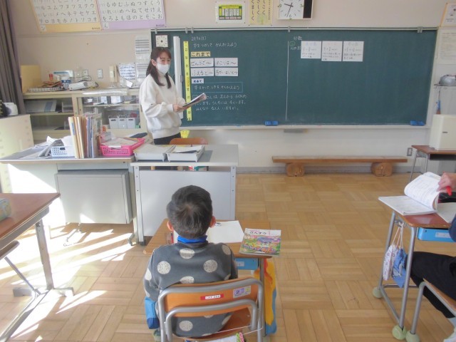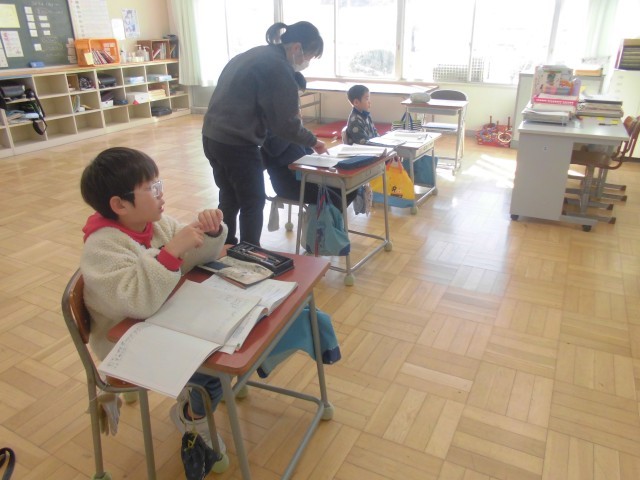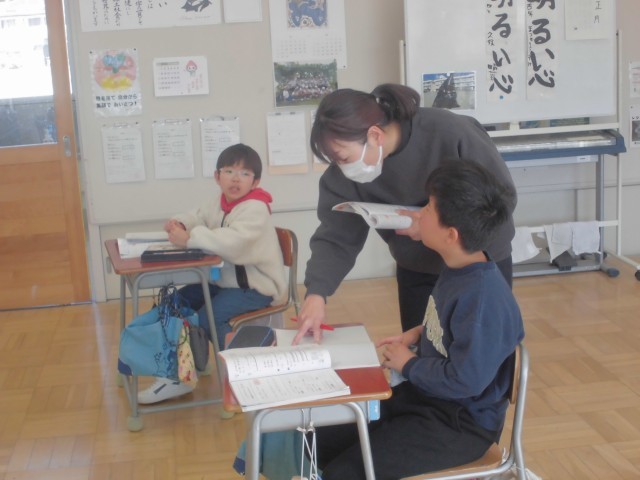 ふた学年同時の算数ですが、先生と助手さんで効果的に授業を進めていきます。