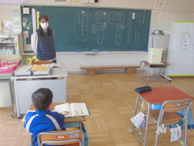 個別の国語の授業と、交流学級で学習発表会に向けて役割演技をするようすです。