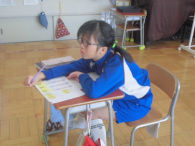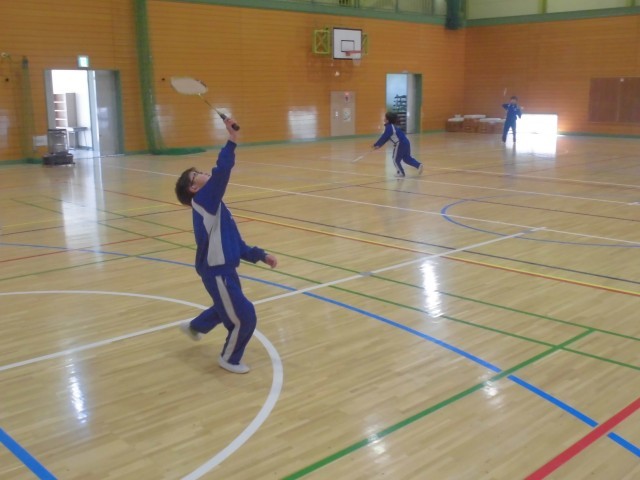 交流学級で体育のバトミントン練習のようすと、個別に新出漢字の練習をするようすです。