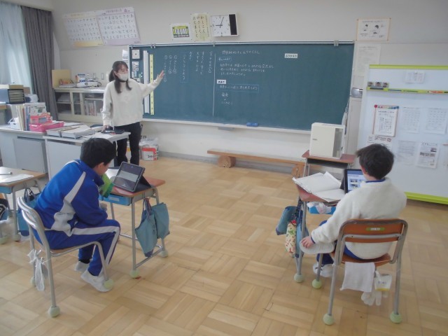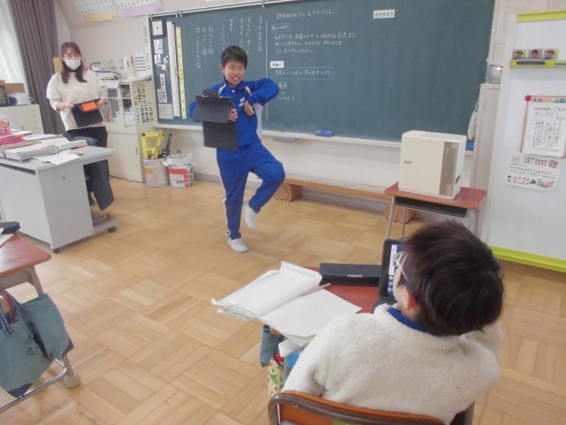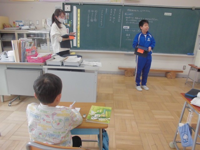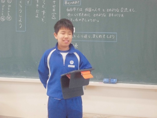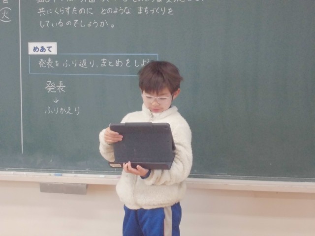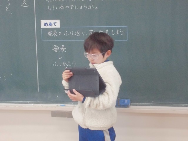社会では、自分で調べてタブレットにまとめたことを発表する場面でした。多少の恥ずかしさを感じながらも、堂々と発表することができました。