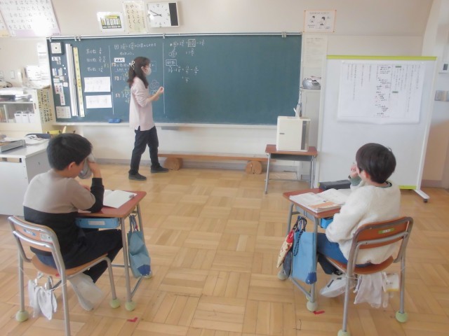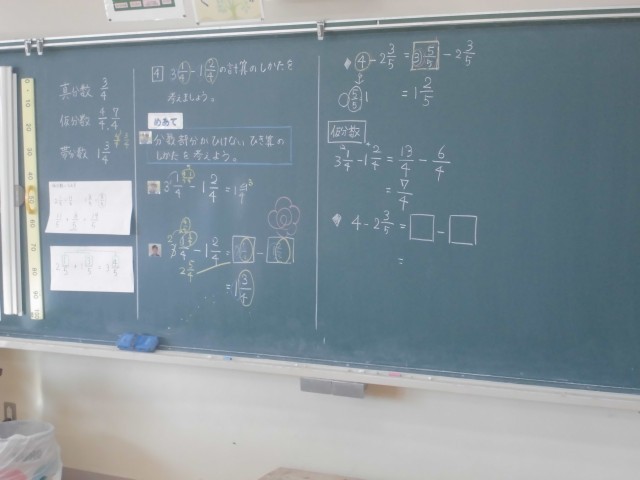 交流学級での図工・図書のようす、個別に分数の計算をする算数のようすです。