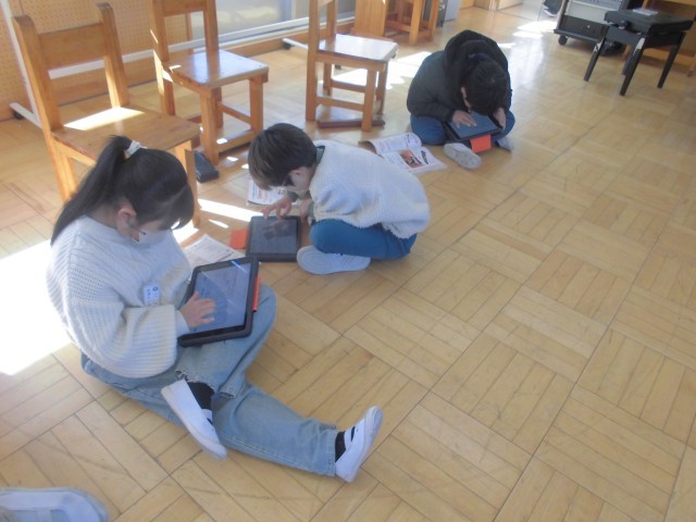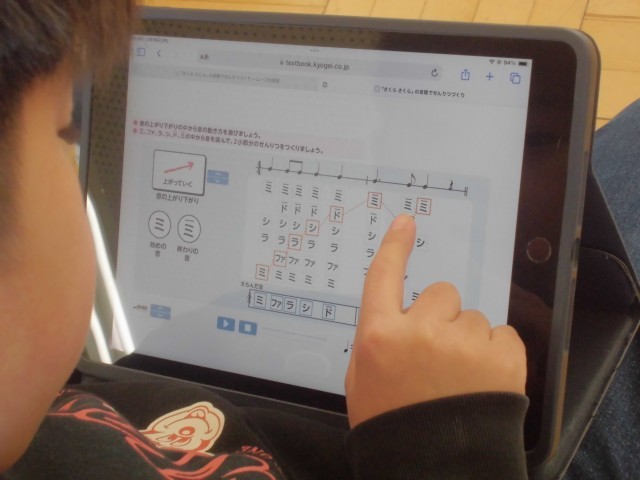 実物のお琴を見た後に、タブレット上でお琴の音で作曲して、仕上がりを確認します。
