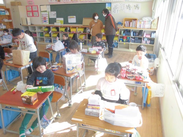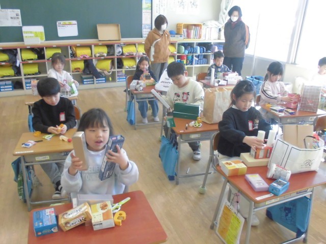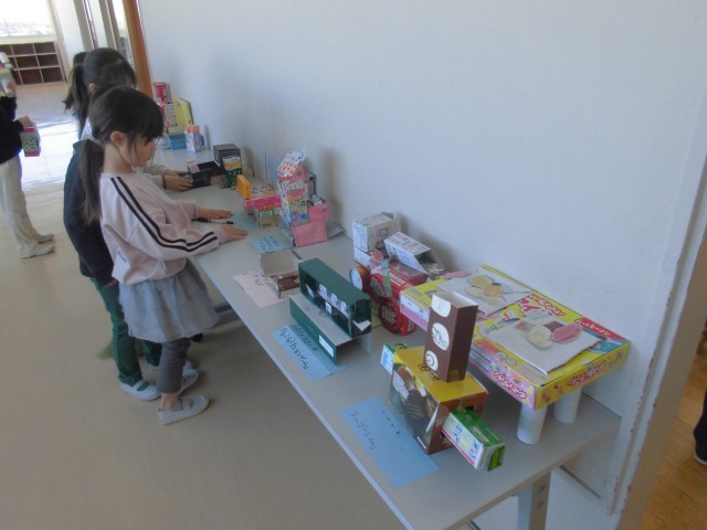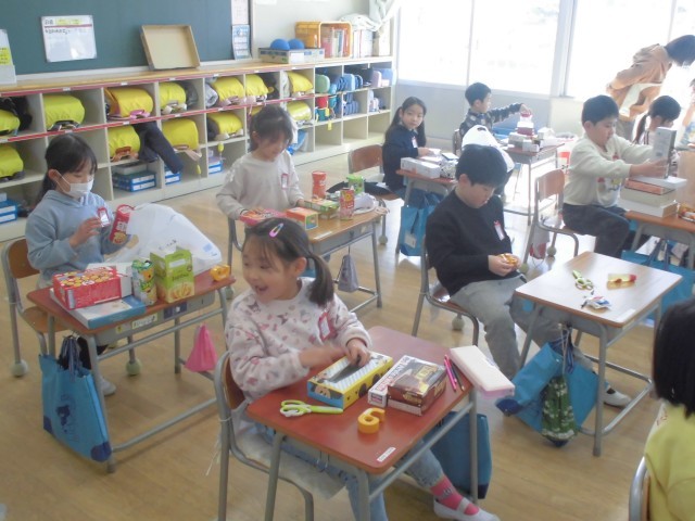 家から持ってきた日用品やお菓子の空き箱を利用して、いろいろ組み合わせた作品が仕上がりました。