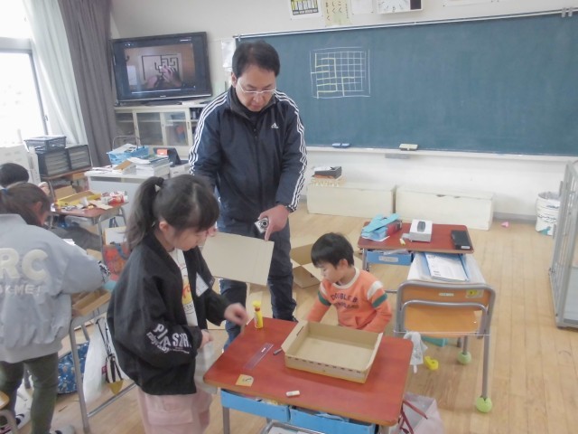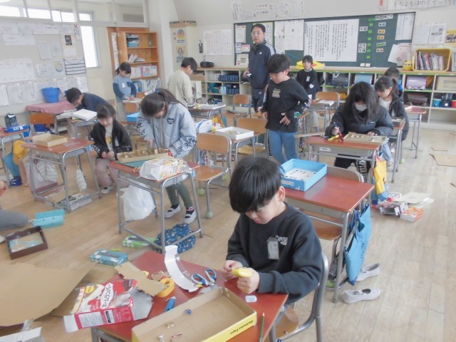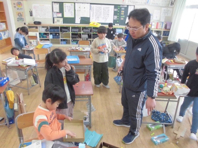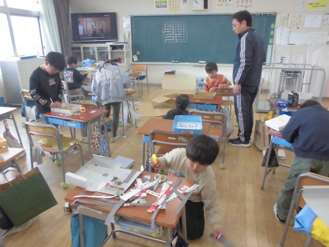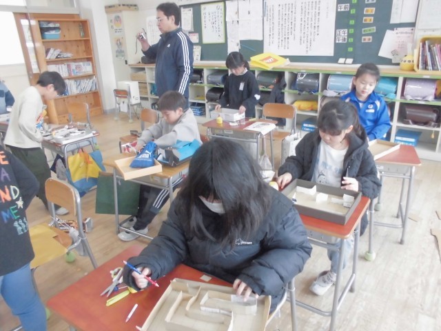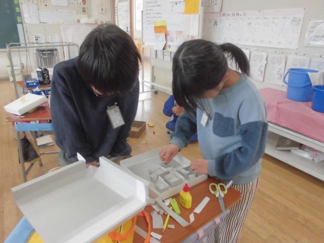 2月24日(火)2年生 図工 公開日 2026/02/24 更新日 2026/02/24 できごと 箱の中にマス目などを書いて、ビー玉が面白く転がるような迷路を作成しています。先生が常にアドバイスしながら回ります。 +7
