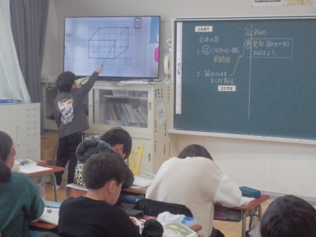 立体の「見取り図」をかく場面でした。自分のやり方をみんなの前で発表し合いました。